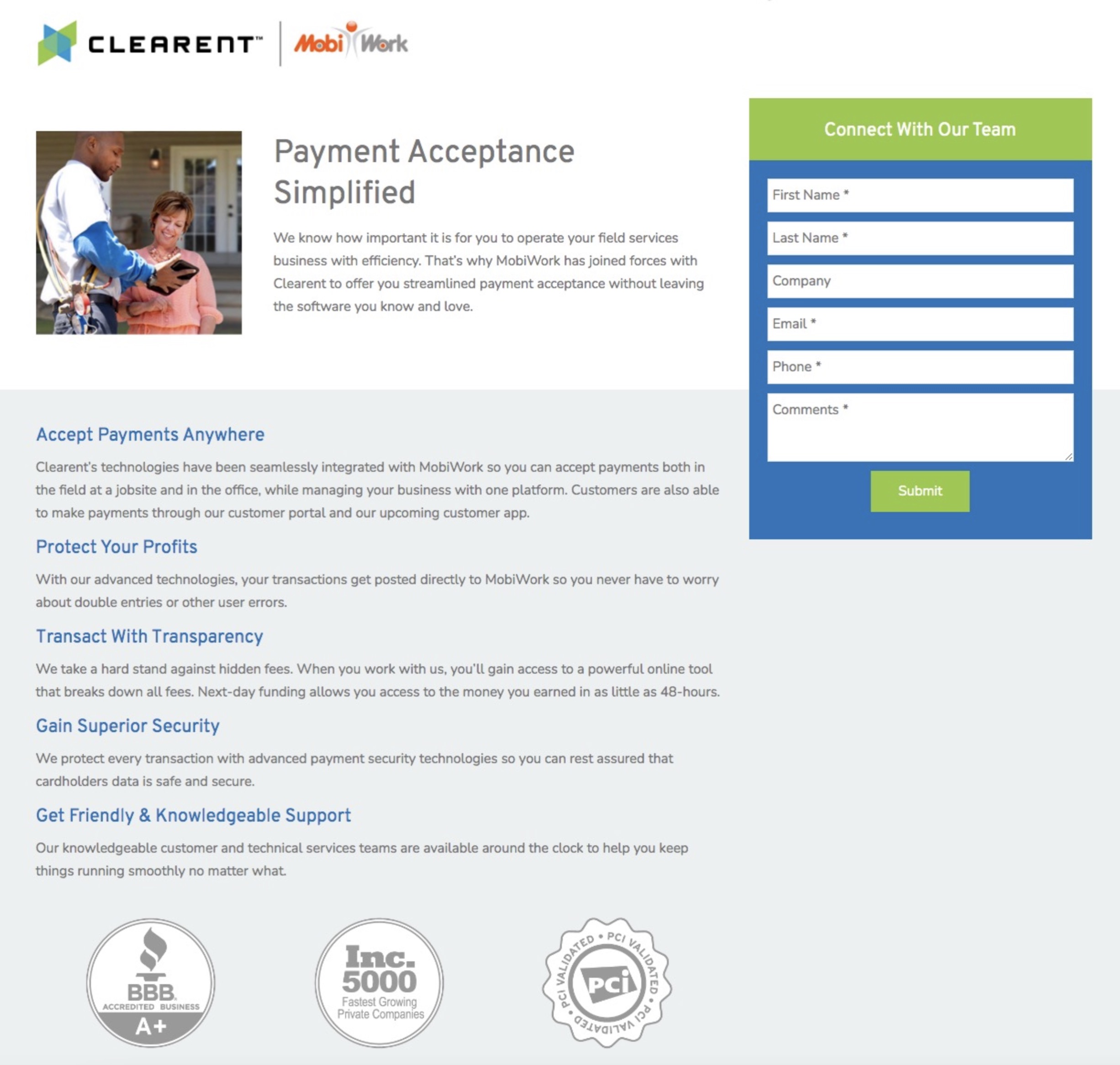1. First, if you do not already have one, please create a Clearent account. You can login or sign-up on their site (https://go.clearent.com/mobiwork.com) and fill out the form. You will then be contacted by a Clearent representative to set up your account: