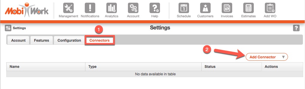 - In your MobiWork account, navigate to Account > Account Settings and click on the Connectors tab.