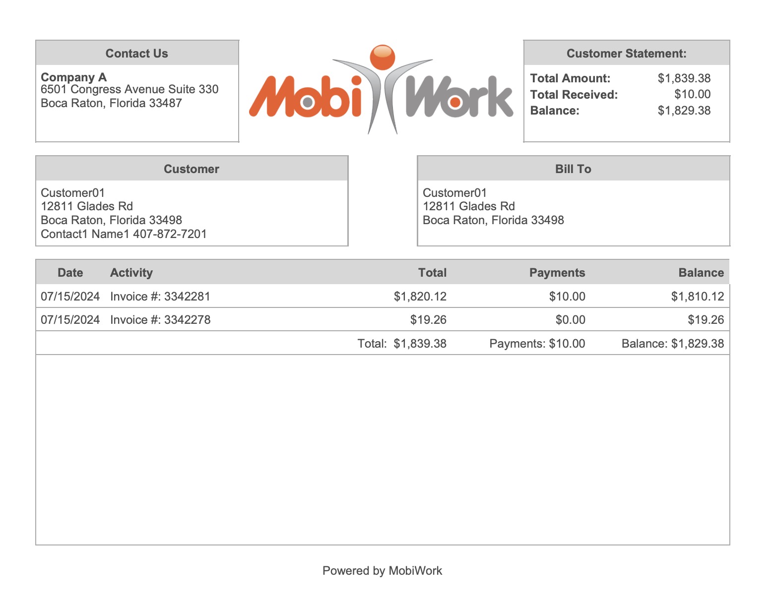 Whereas, the "Send Customer Balance Statement" option sends the invoice balance statement; this statement provides a summary of the invoices with the "Customer Invoiced" status, any payments made towards those invoices, and the remaining balance: