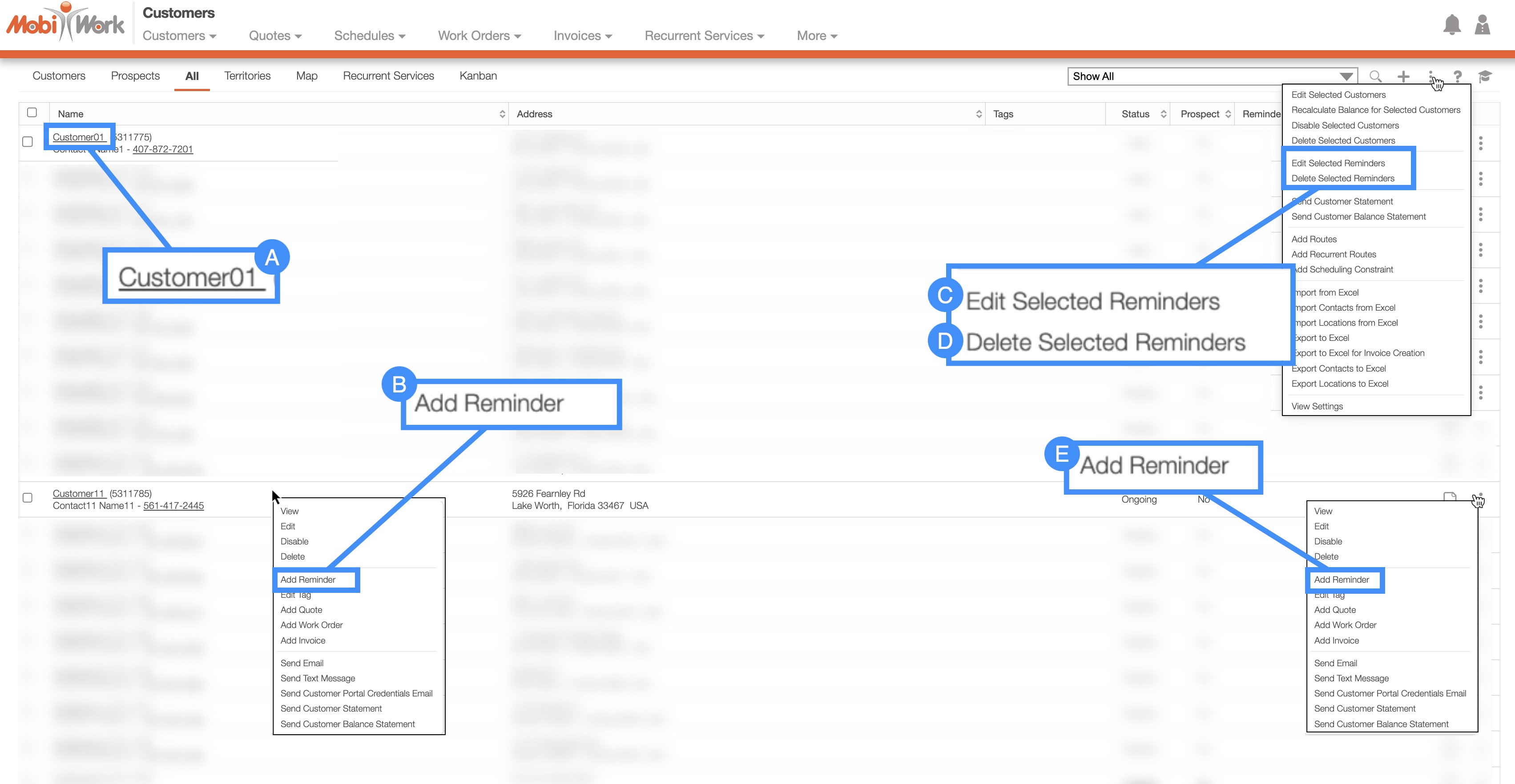 From the Customers feature page, there are several different ways to add, edit, and remove reminders. The following image will highlight how to access these actions: