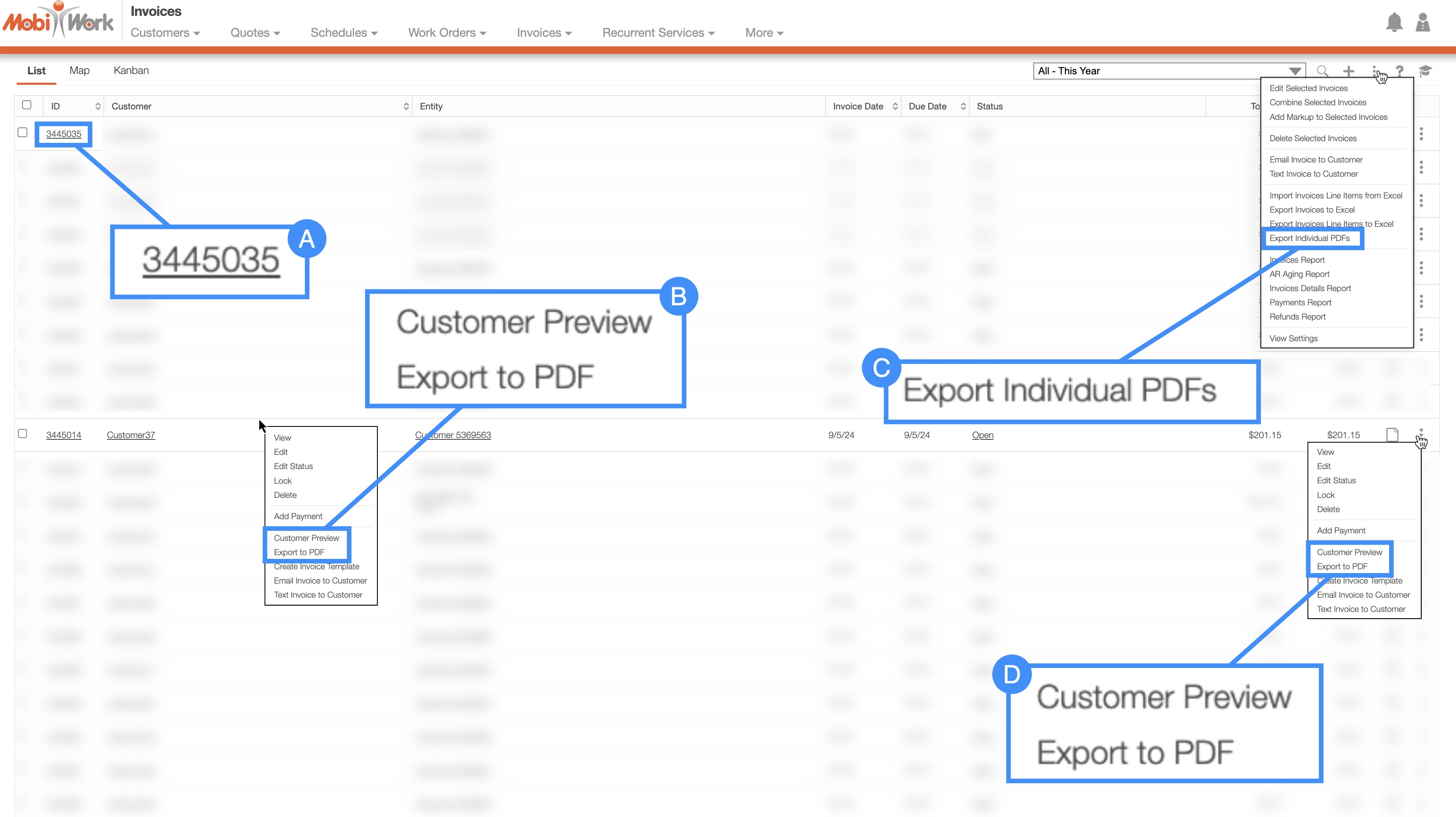 - Select the Individual Actions under the "Actions" column and select the "Export to PDF" or "Customer Preview" option from the drop-down.