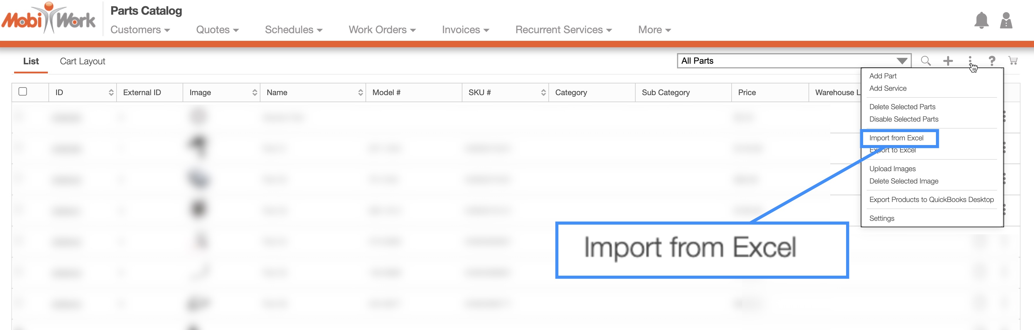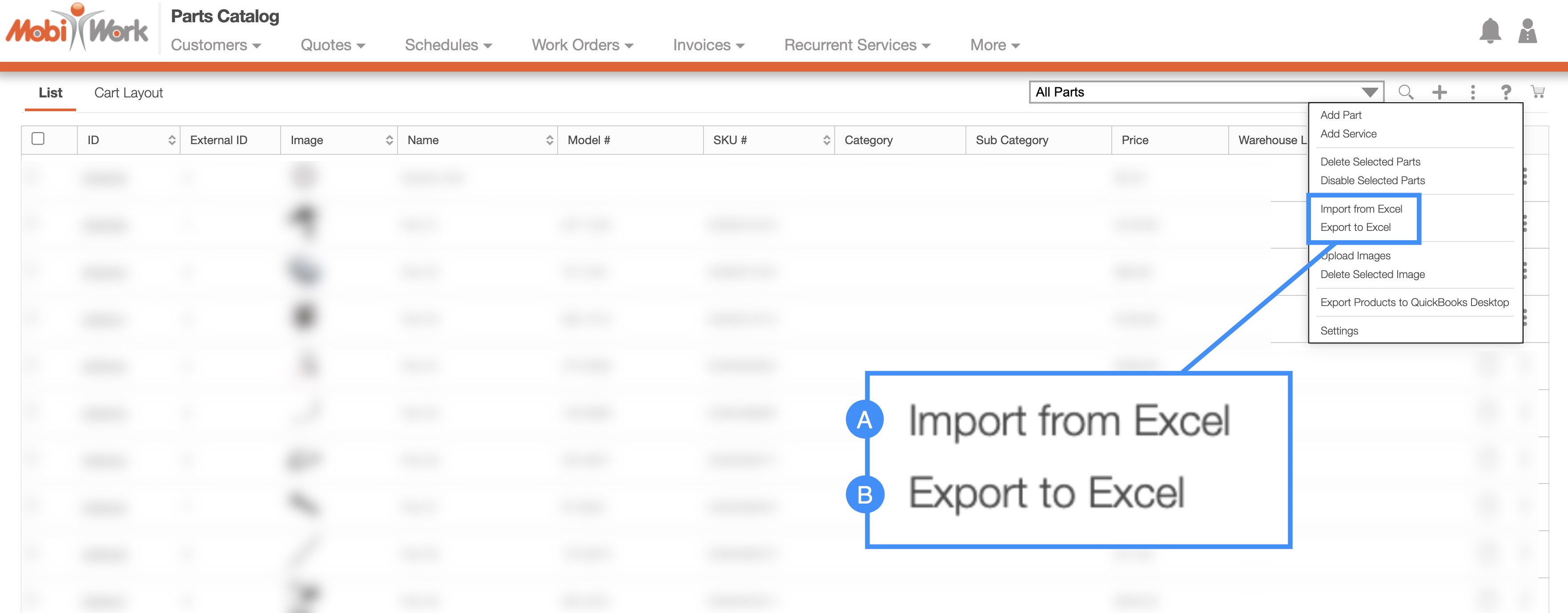 Within MobiWork, you will be able to import and export your parts to and from an Excel document; this section will highlight how to access the import/export feature.