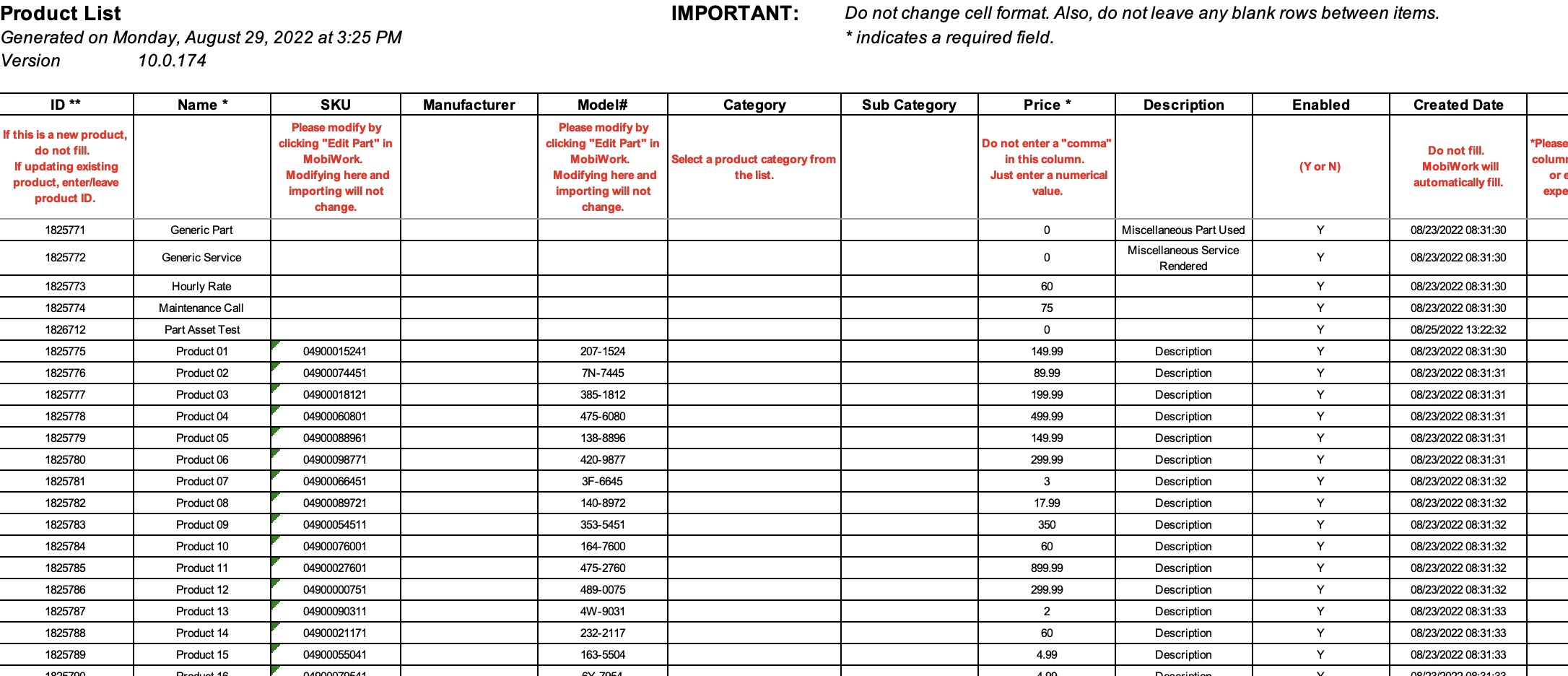 The newly uploaded parts and services from Excel will then be displayed in MobiWork with your other parts and services.