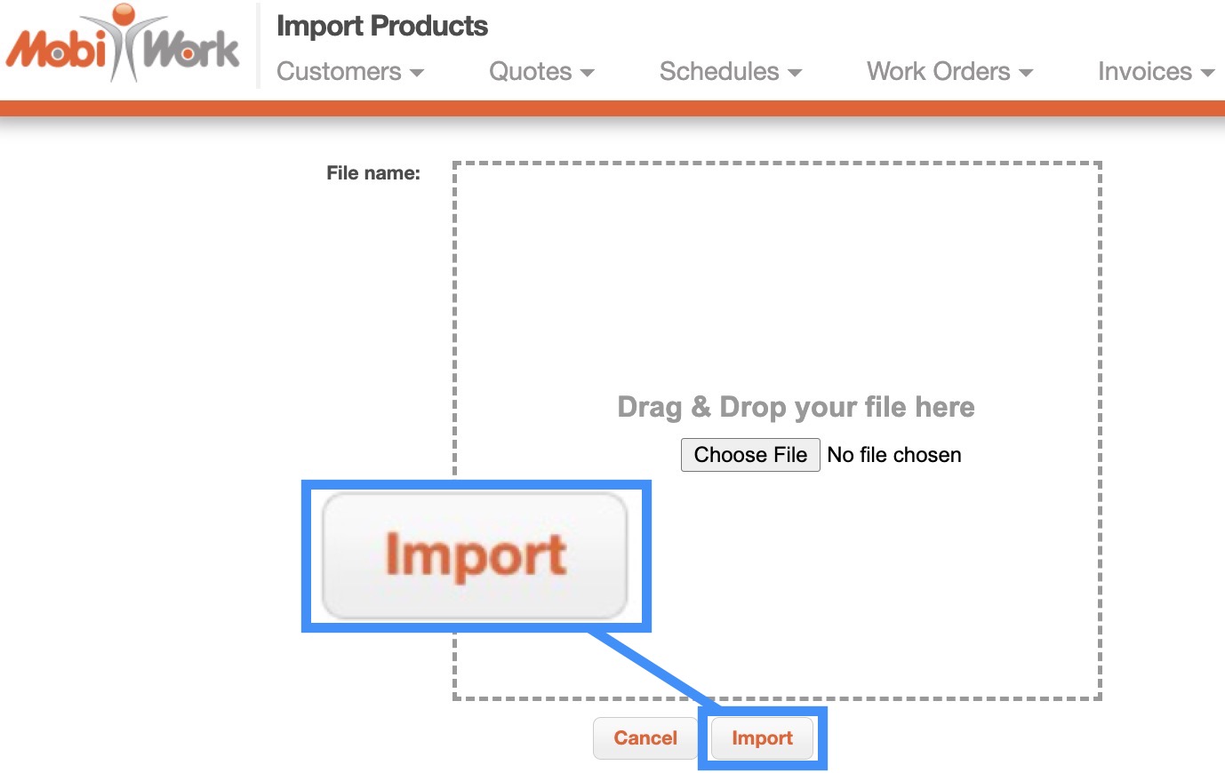 Once you have entered the parts and services in the Excel document correctly, you can upload that document to MobiWork.