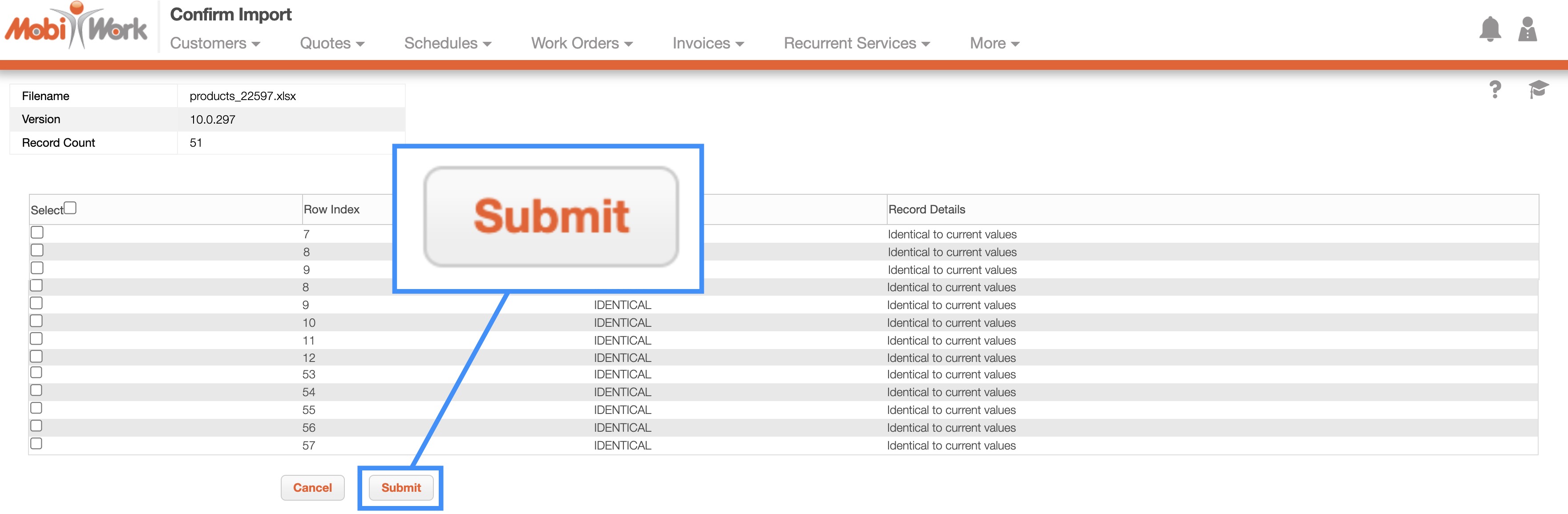 You will then be redirected to the Confirm Import page. Confirm your imported Excel file by hitting the Submit button: