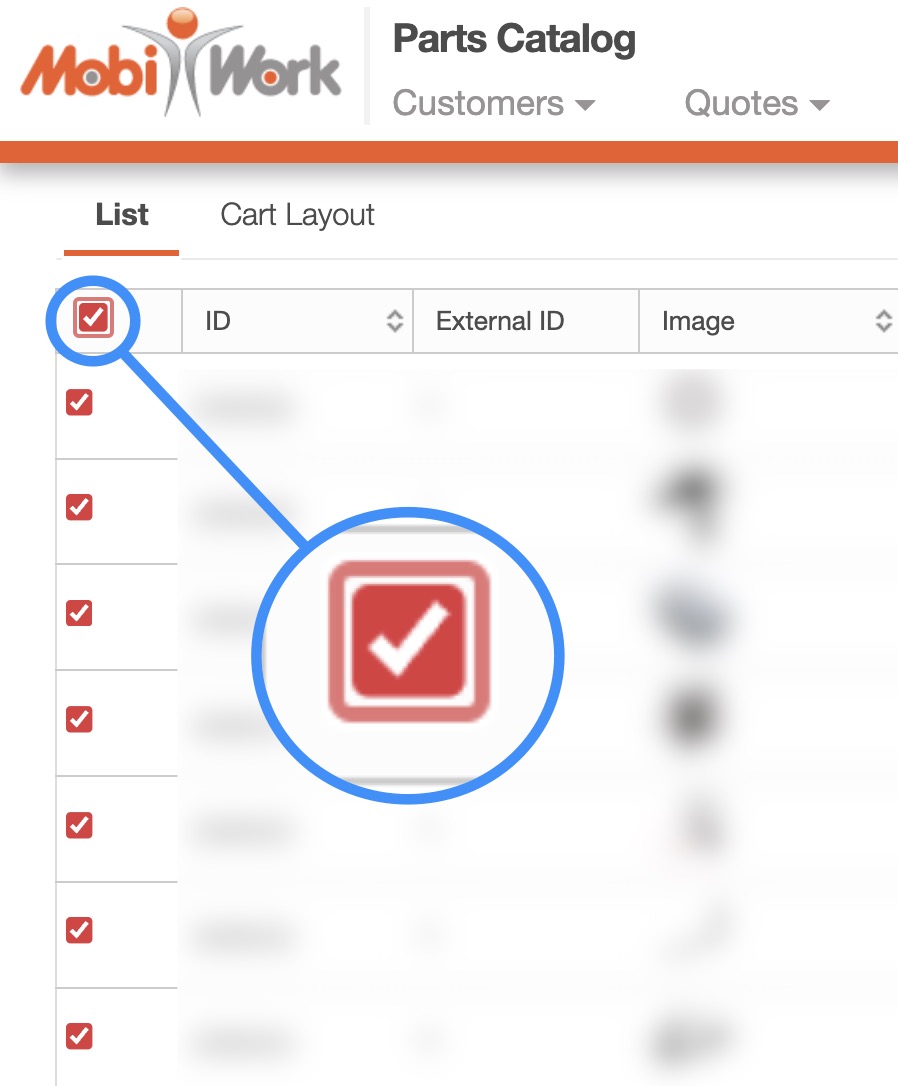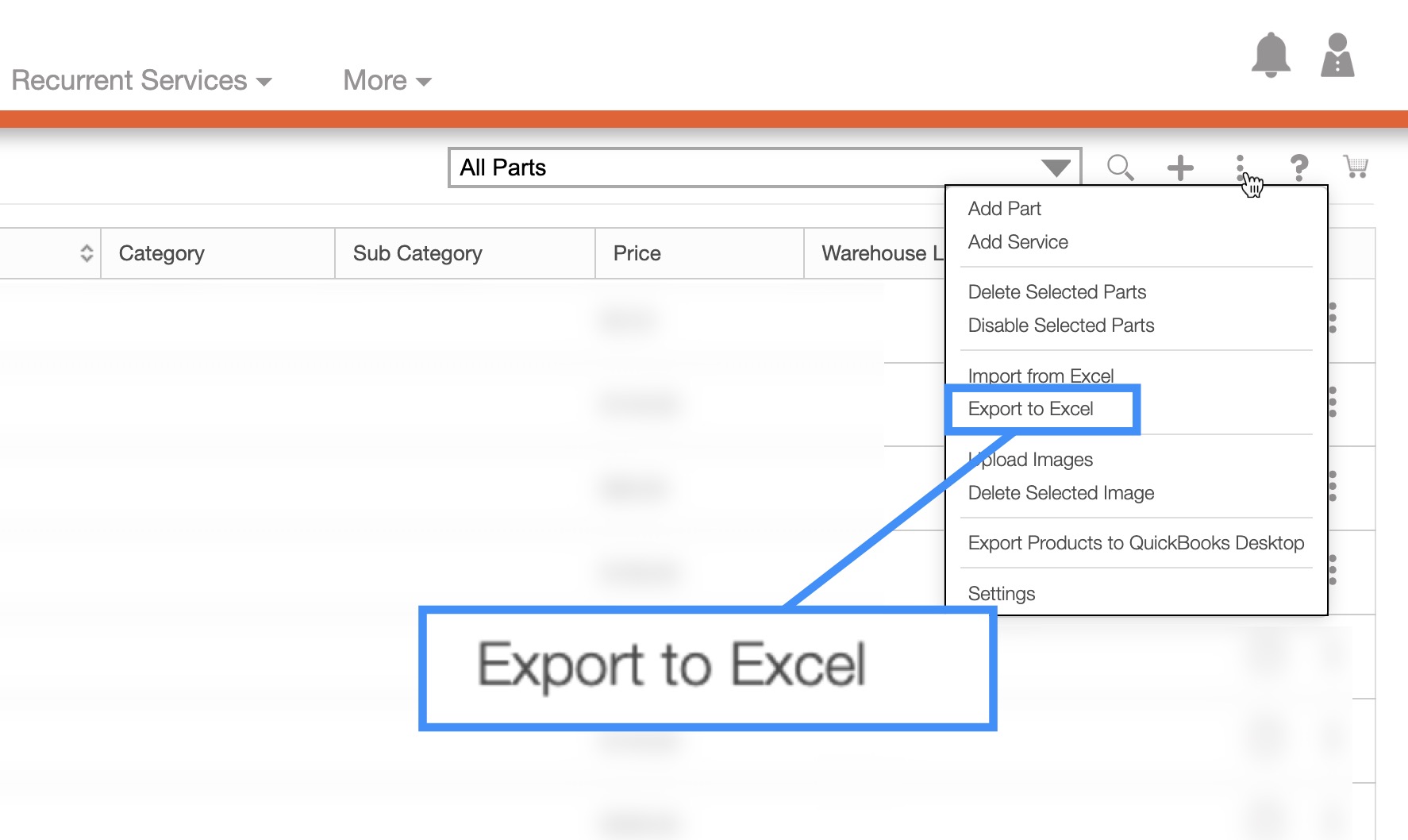 - Please note that if you would like to export all your parts and services into Excel you can click on the topmost checkbox (Multiple Selection Area) located under the tabs. Likewise, if you do not select any entries ALL records will be exported: