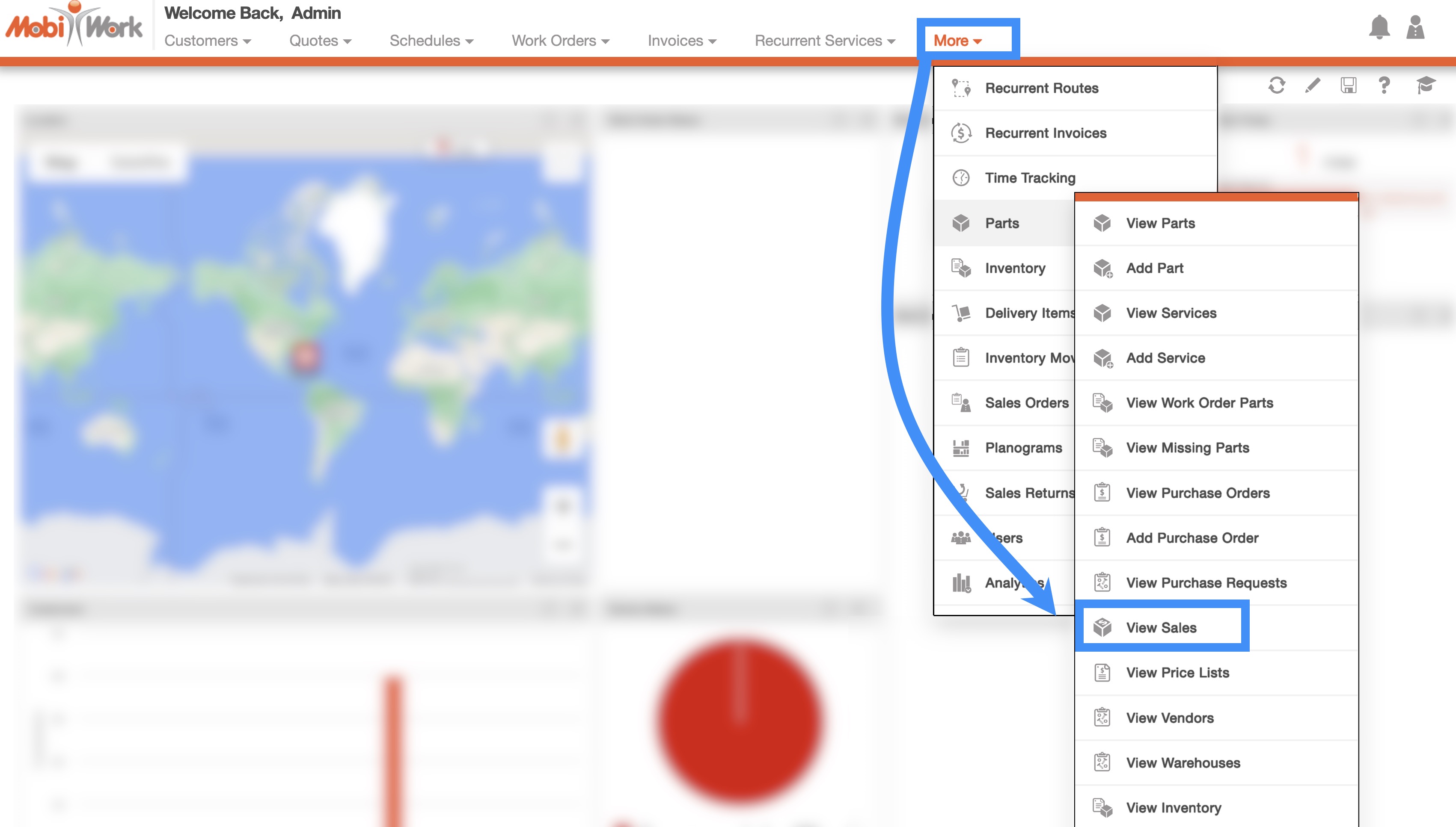 You can access the Parts Sales page by hovering over the Parts feature from your MobiWork menu and clicking on the "View Sales" option when it appears: