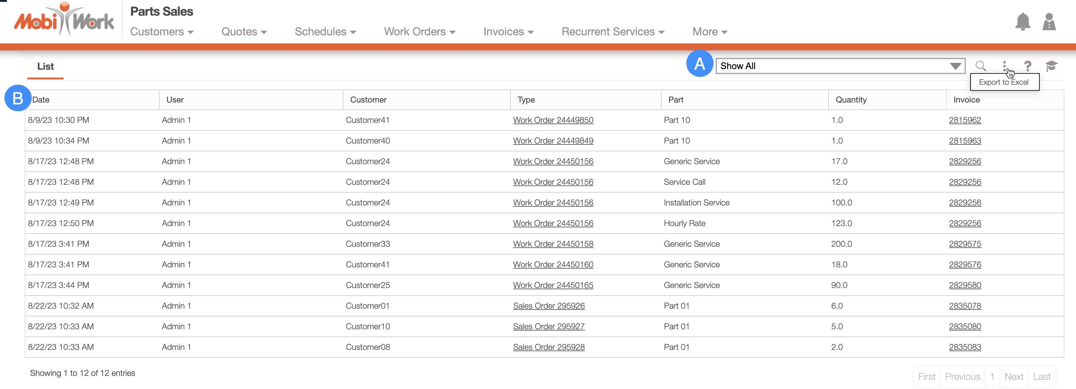 The Parts Sales page will display all the sales orders and invoices of parts or services sold. On this page, you will be able to search through all your sales and export them to Excel.