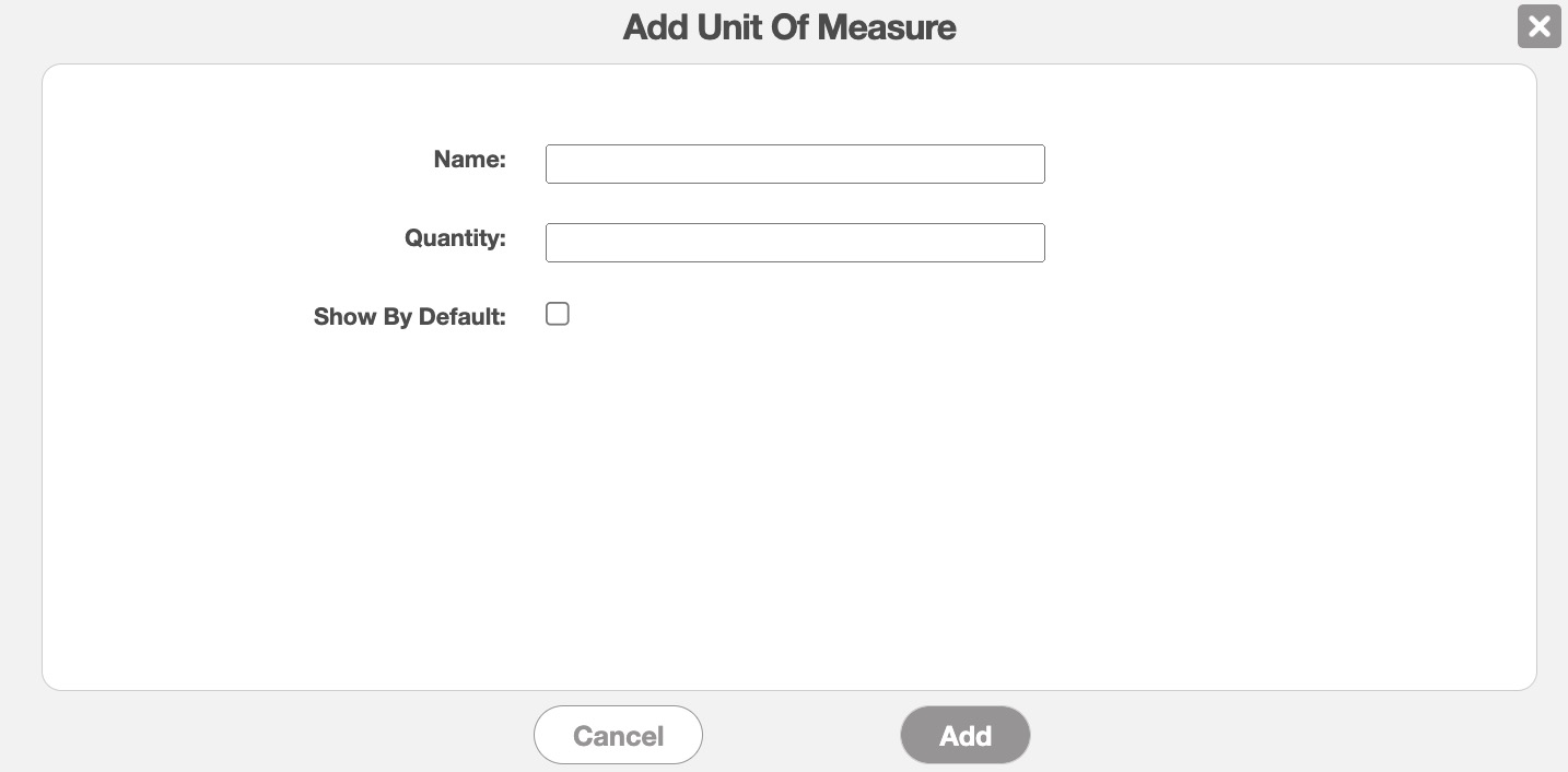 To add a new unit of measure, click on the Add Unit of Measure button and the Add Unit of Measure pop-up window will appear: