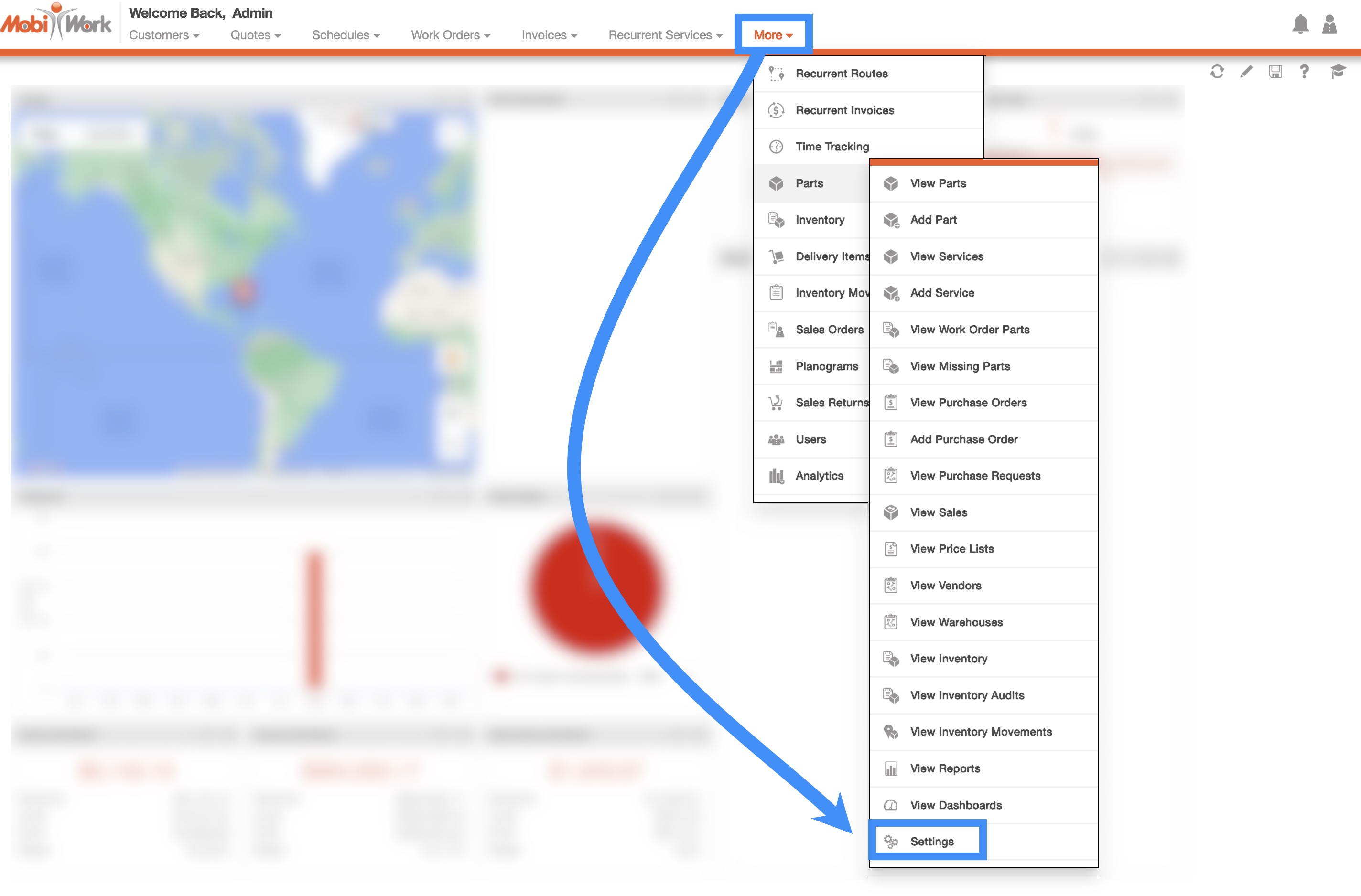 You can directly access the Parts Settings page by selecting the Parts feature from MobiWork, and clicking on the "Settings" option:
