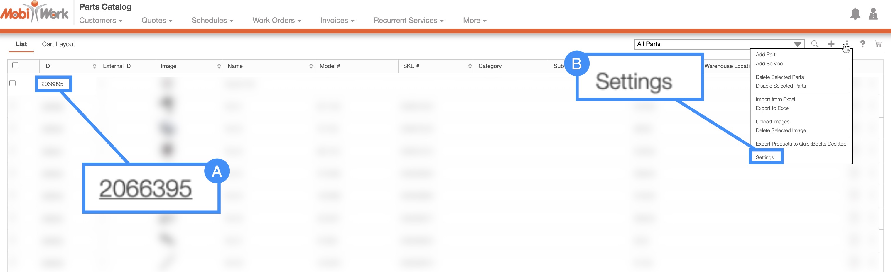 From the Parts feature page, there are two different ways you can access the Parts Settings page. For more information on how to access the Parts List tab please see the Parts List (Catalog) page: