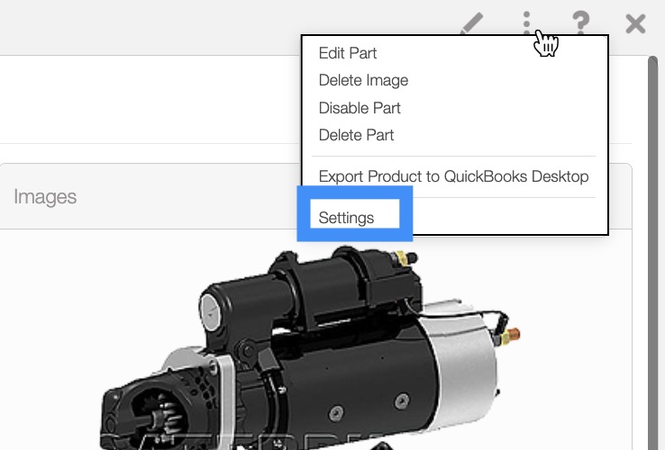 By clicking on the More Actions button located at the top-right of the Parts Catalog and from the drop-down select the "Settings" option.