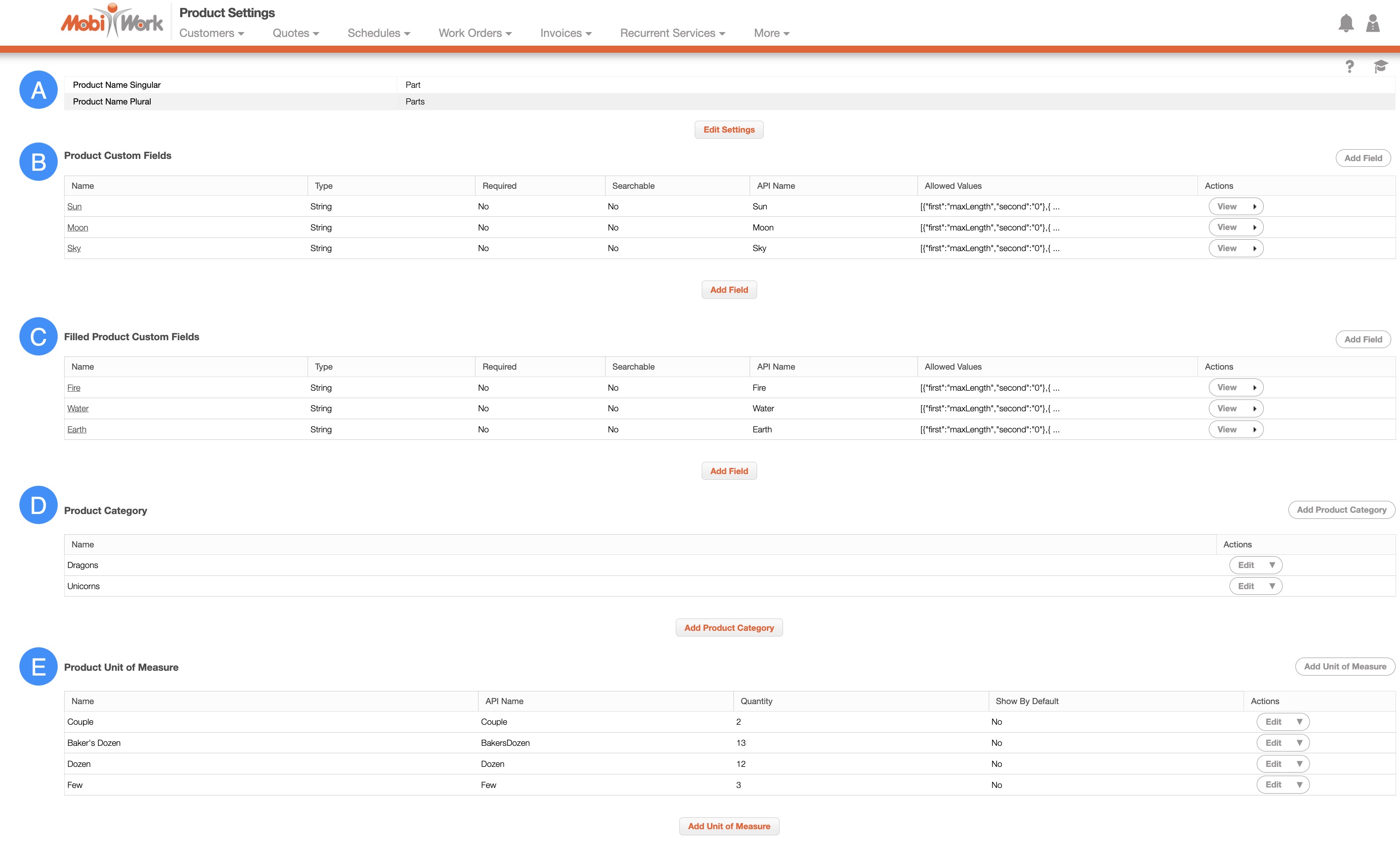 On the Parts Settings page you will be able to add or edit custom fields, categories, and even create a Product Unit of Measure, which will allow you to define the number of parts or services being sold at once.