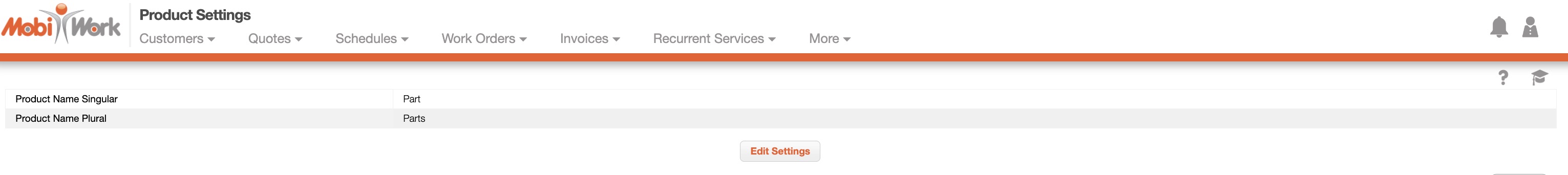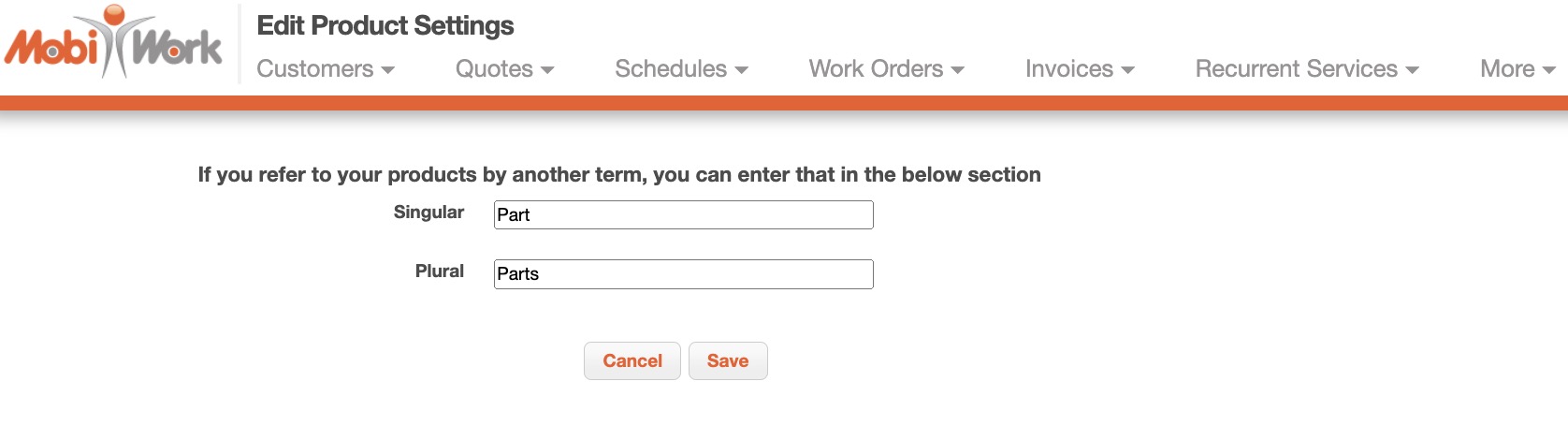 The "Parts Settings" section will display both the singular and plural versions of how you refer to your MobiWork parts and services (e.g., product / products, stock / stocks, etc.):