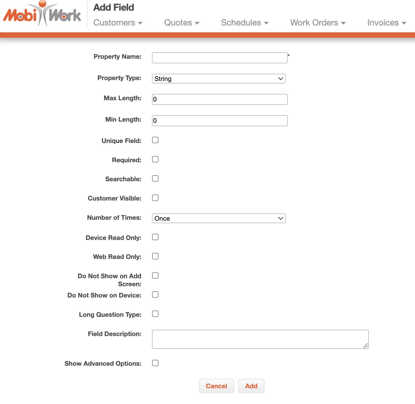 | "Property Type" | is the type of custom field which include string, number, decimal, date, yes/no, multiple choice, QR code, signature, header, image capture, notes, phone number, phone number plus extension, SSN, time field, text area, vertical separator, vertical spacing, multiple QR code, customer field, product field, user field, project field, asset field, store field, dynamic header, and multiple option dropdown. |