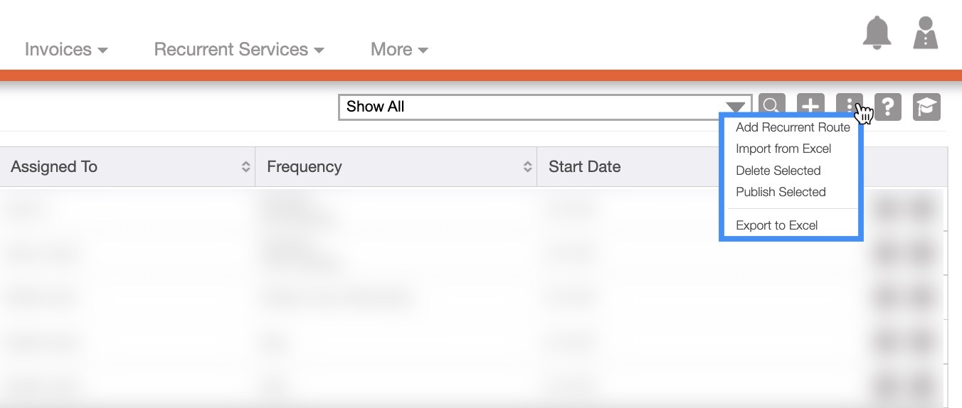 The More Actions button (represented by the three vertical dots) which will allow you to delete the recurrent route, import/export from excel, and more.