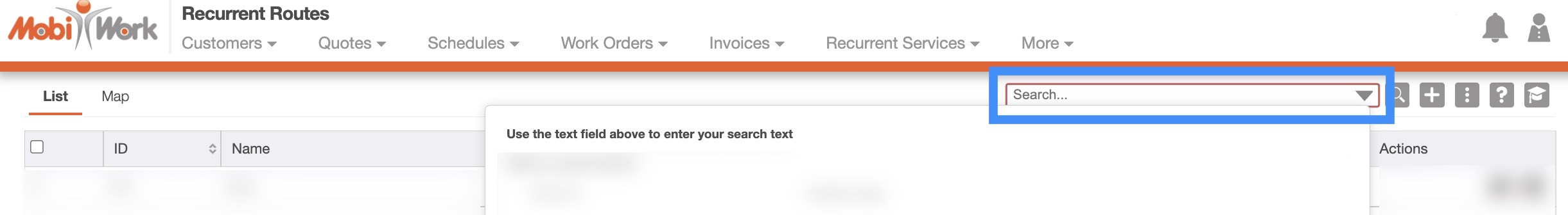 The "List" tab will display your recurrent routes' ID, the recurrent route name, the number of stops, the frequency, and the start date:
