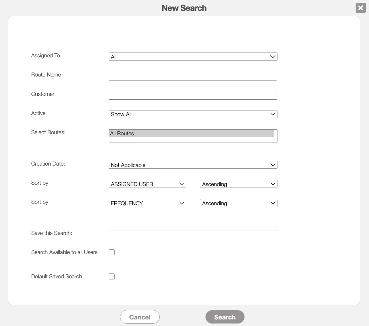 | "Sort By" | Sorts your search in ascending or descending order by: name, assigned user, frequency, and creation date. |