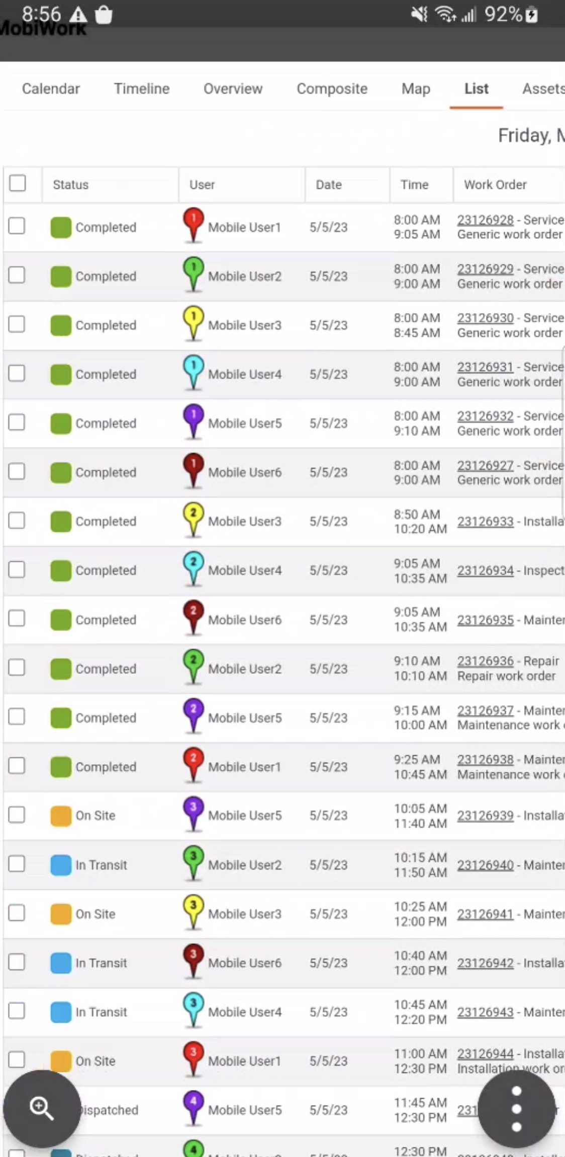The "Composite" tab will display all the information regarding your scheduled work orders, including the assigned user, their location on a map, etc.
