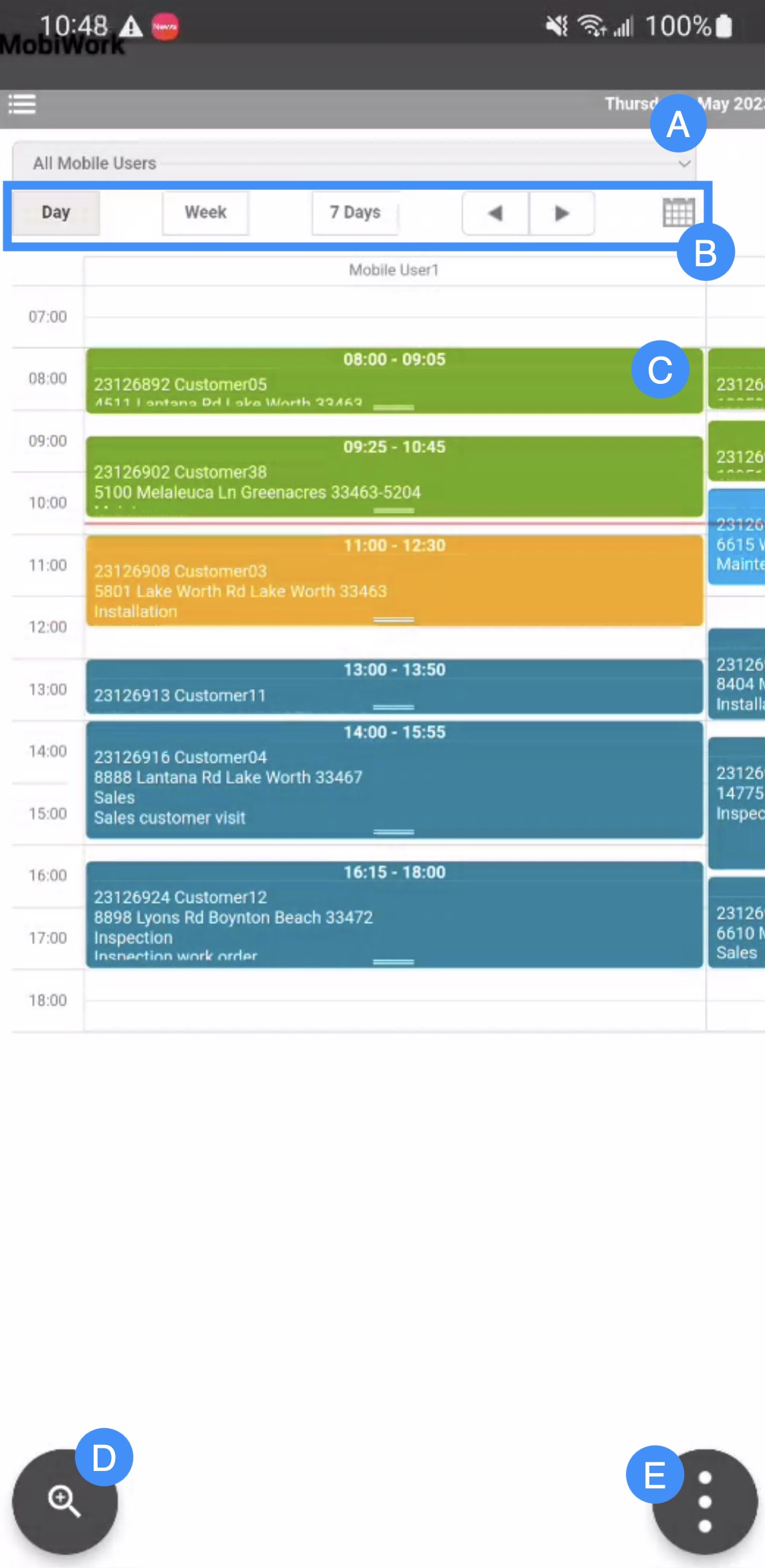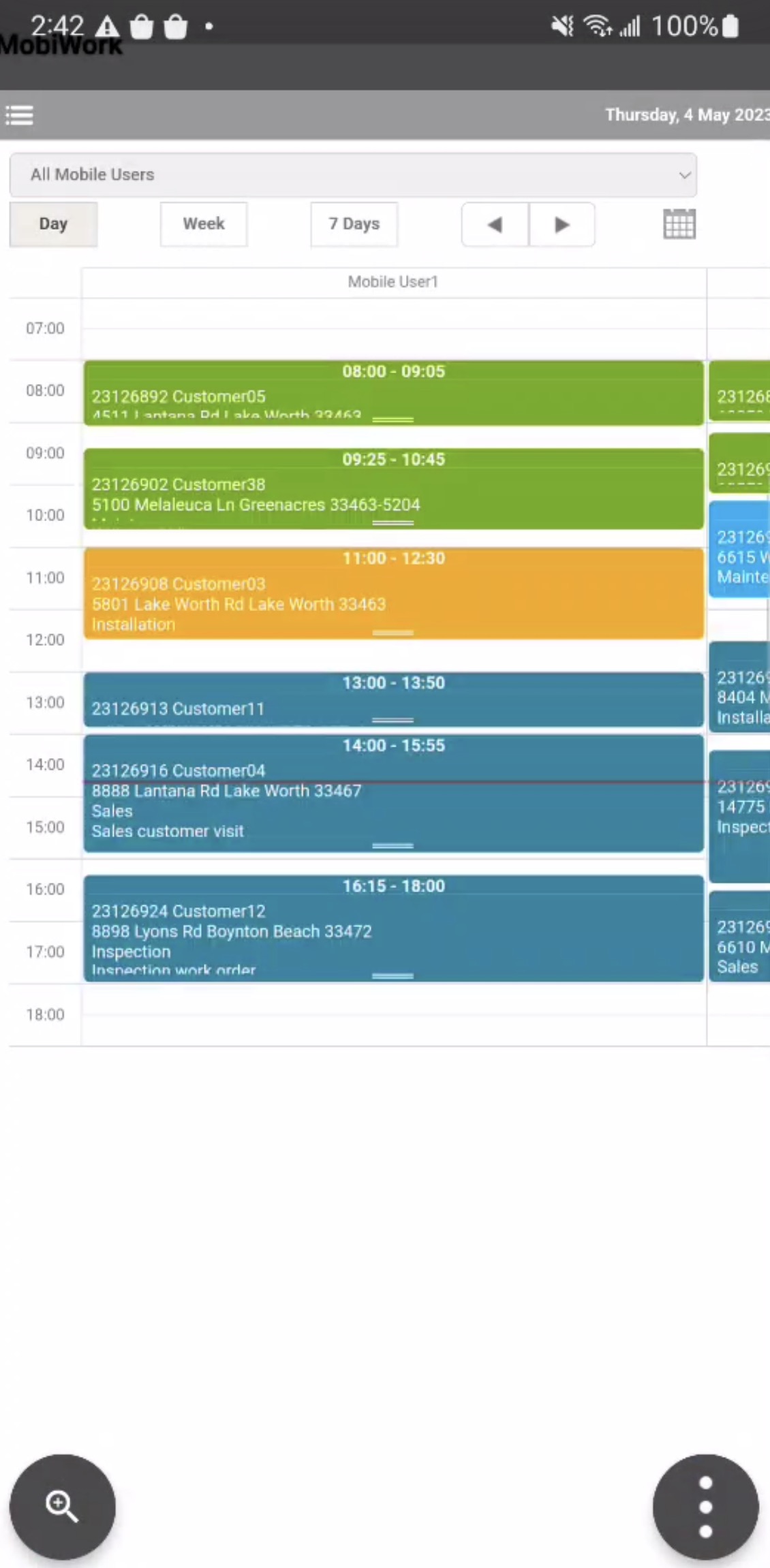 The work orders assigned to the user will be displayed on the Schedule View. This view is identical to how the schedule is displayed on the MobiWork web application.