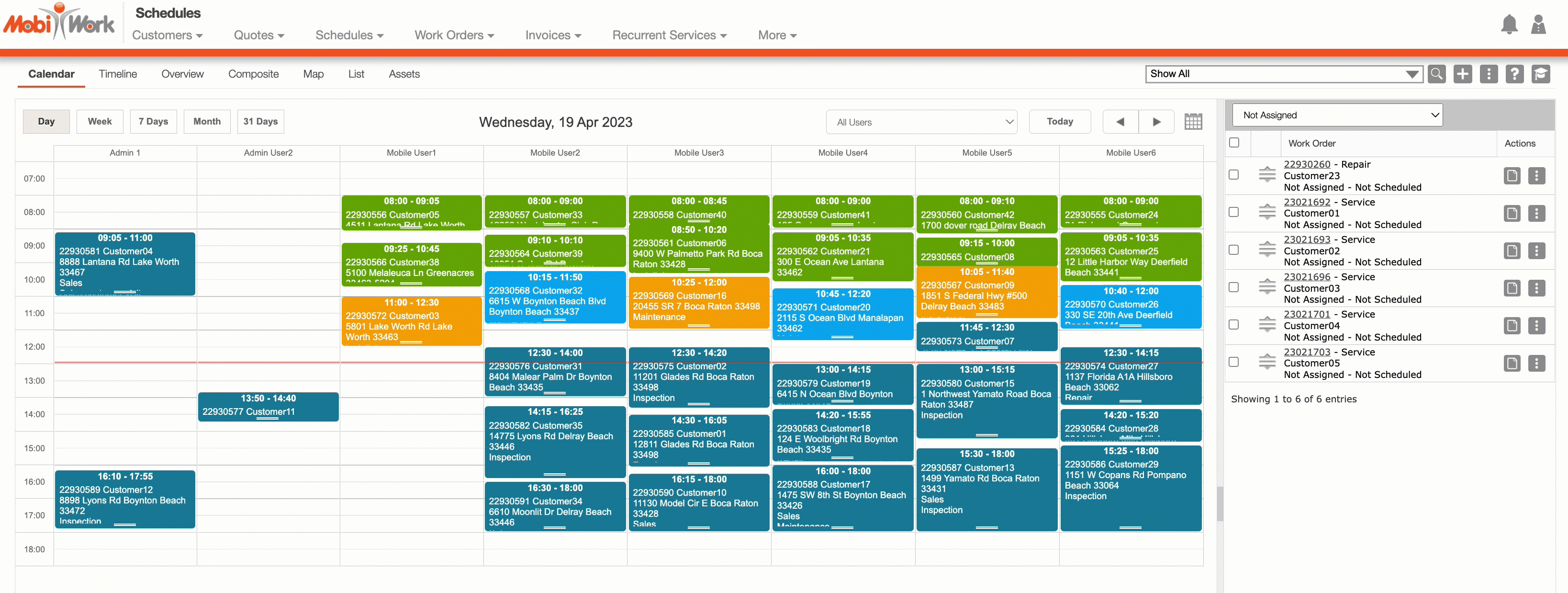 The Schedules feature page will visually display your work orders and the users assigned to them. From this page you will be able to dispatch users to their respective work orders, optimize routes based on distance, and more!
