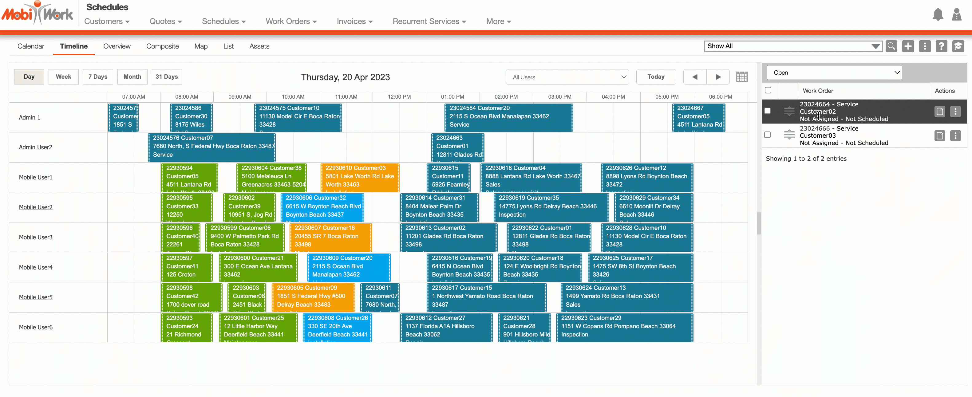 The "Timeline" tab will visually display work orders in a time-date format with the assigned users shown to the left of the work orders. You will be able to easily view which user is assigned which work order: