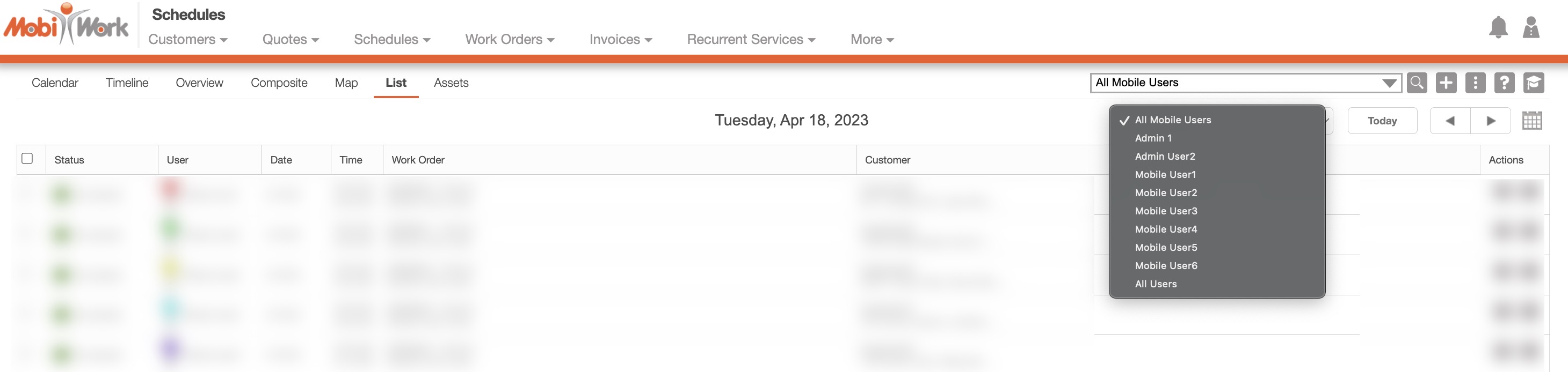 The "List" tab is the one of tabs that can be found once you navigate to the Schedules feature page; from this page you can navigate to other tabs and see all your user schedules, dispatching, and work order data summarized on one page.