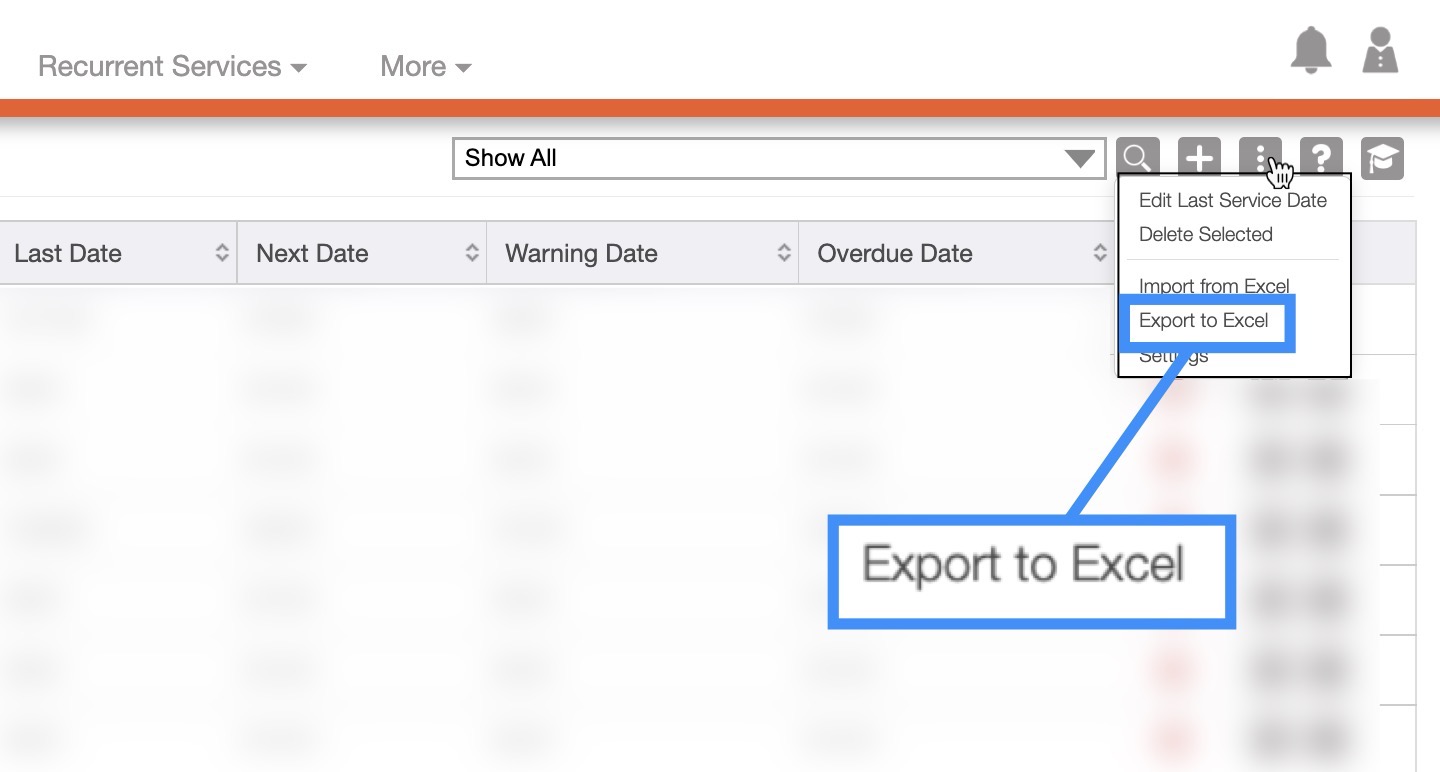 When you are on the Recurrent Service feature page, select the More Actions button and from the drop-down click on the "Import From Excel" option: