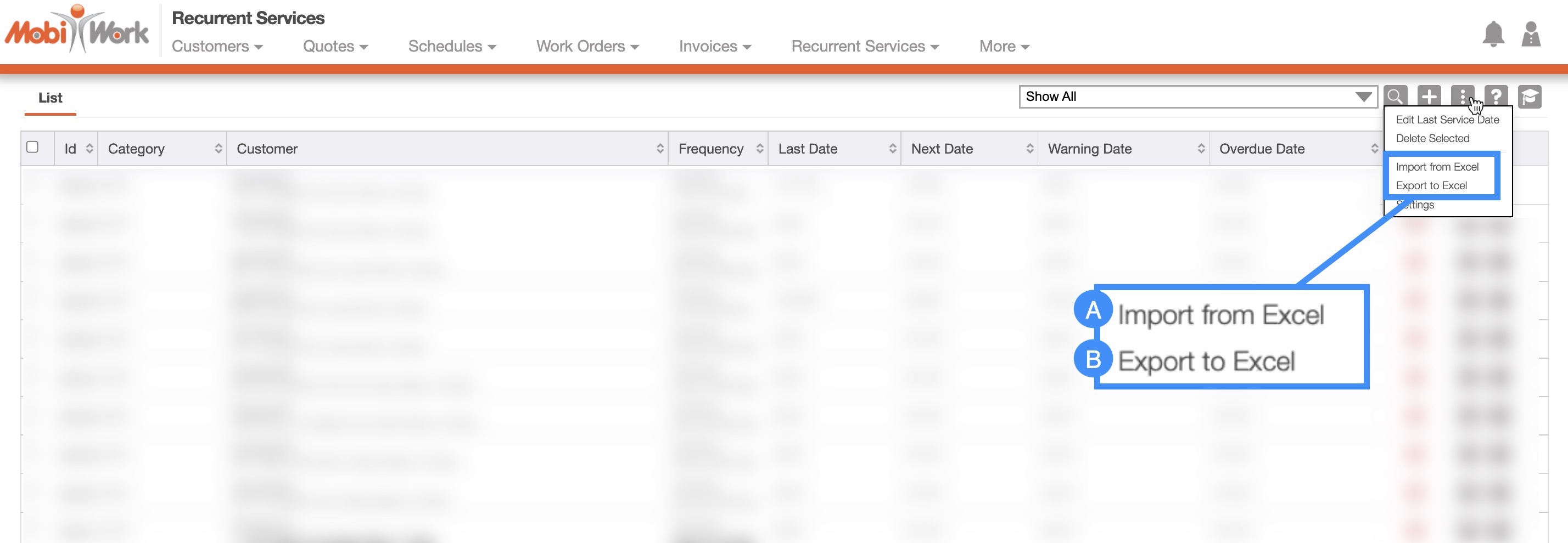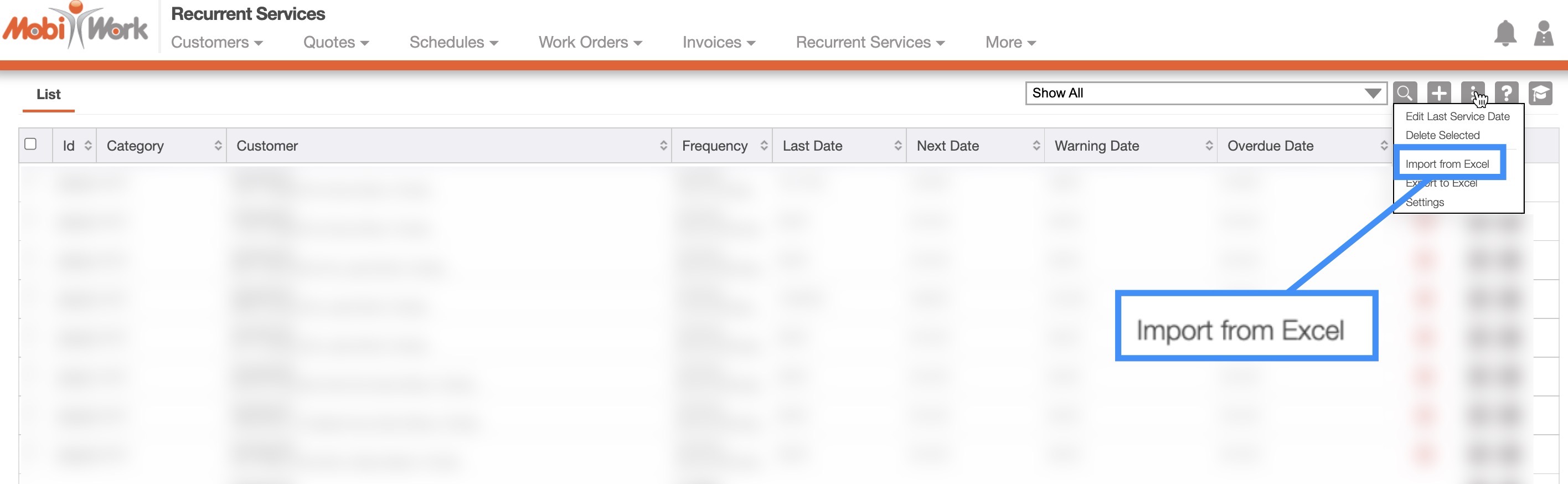 Within MobiWork, you will be able to import and export your recurrent services to and from an Excel document; this section will highlight how to access the import/export feature.