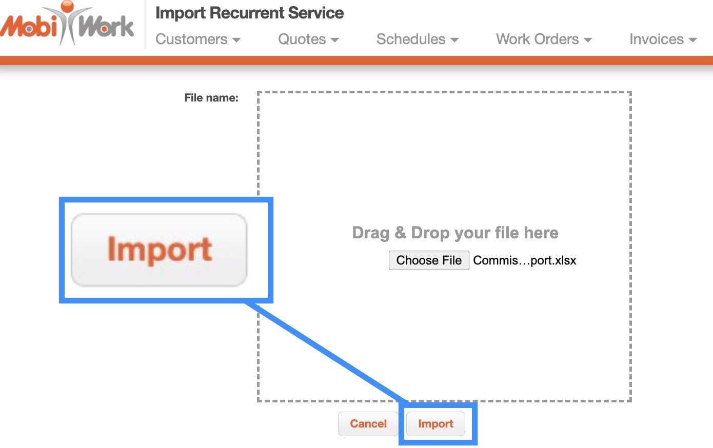 Once you have entered the recurrent services in the Excel document correctly, you can upload that document to MobiWork.