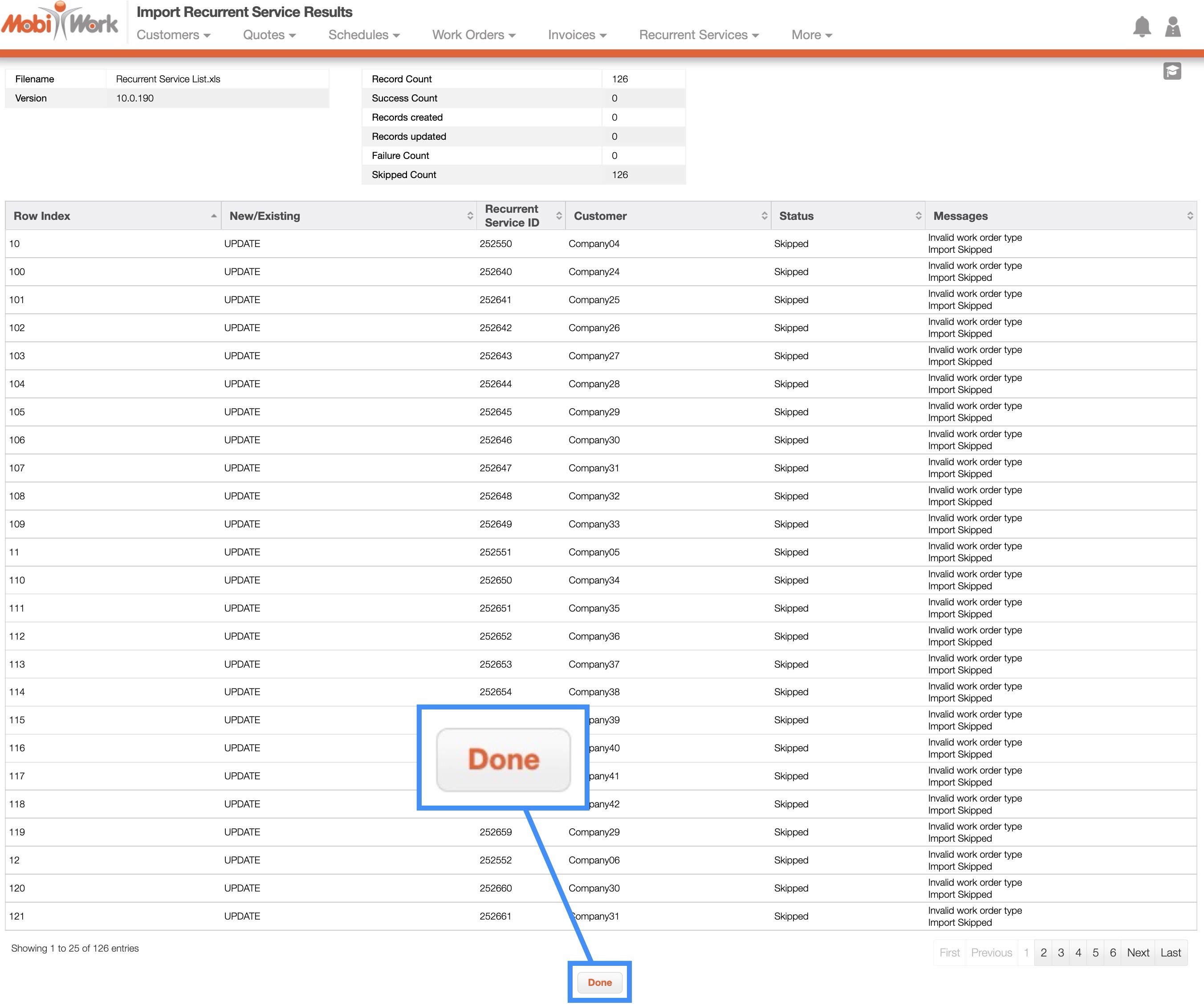 Once you are redirected to the Import Recurrent Services Results page, click the Done button: