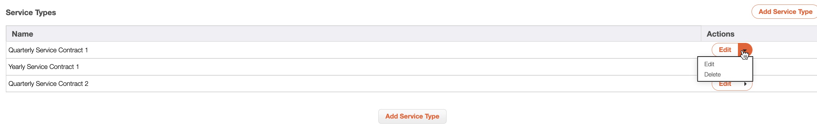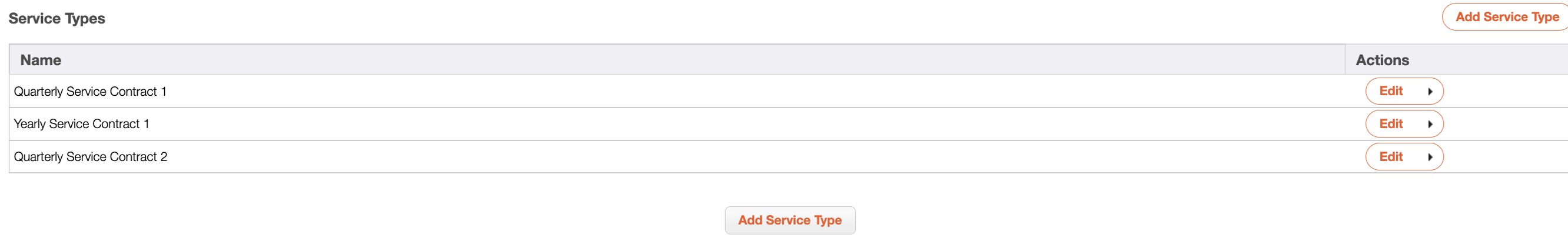 You can add, edit, or remove service types for your recurrent services in the Service Types section. The service types listed here, indicate how often a service is contractually obligated to be completed for a customer, user, or an asset: