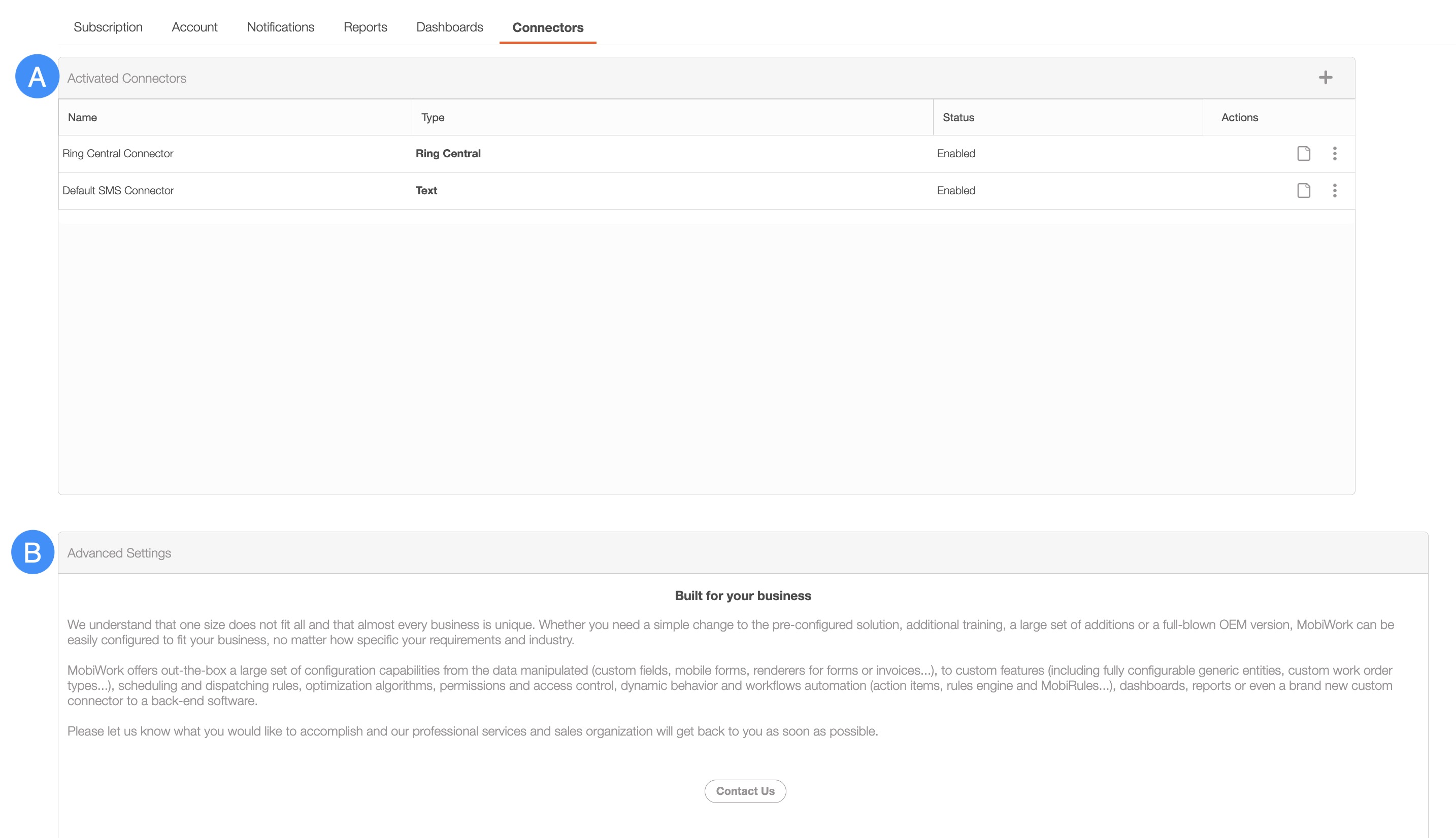 The "Connectors" tab will display which connectors are activated within your MobiWork account; from this page you can navigate to other tabs to view additional account settings: