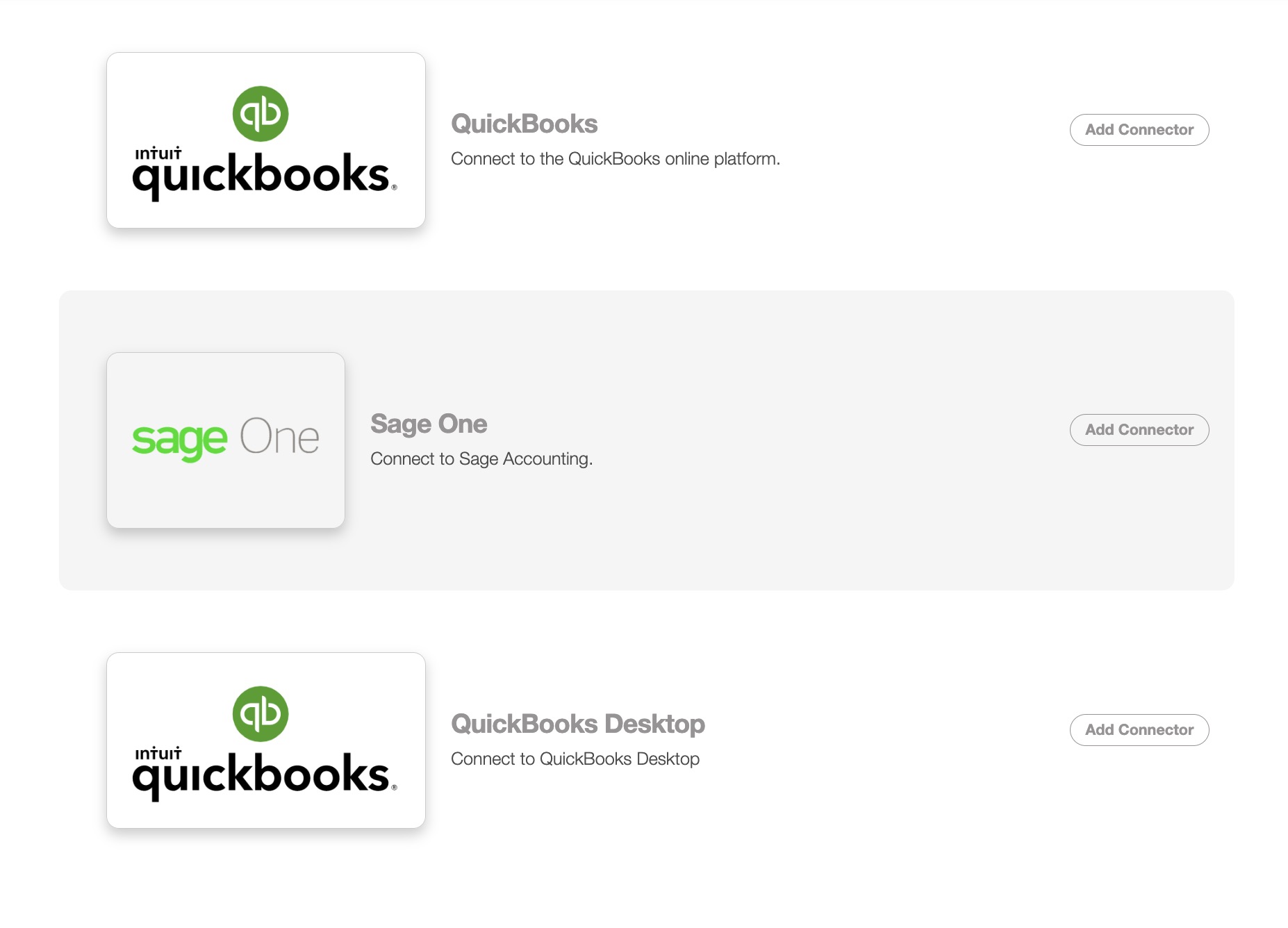The "Connectors" tab will allow you to view and add connectors to your MobiWork account. These connectors will allow you to interact with QuickBooks, Sage, etc. with your MobiWork account.