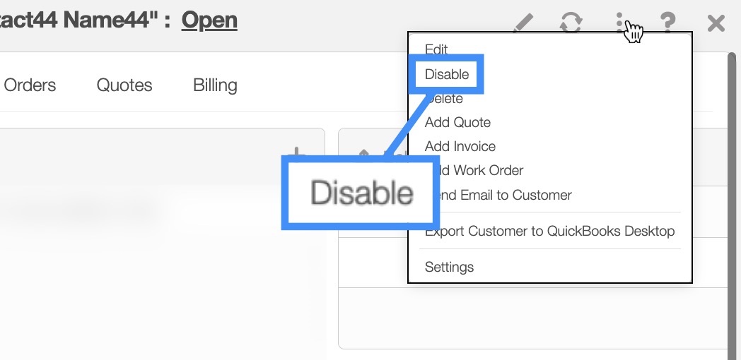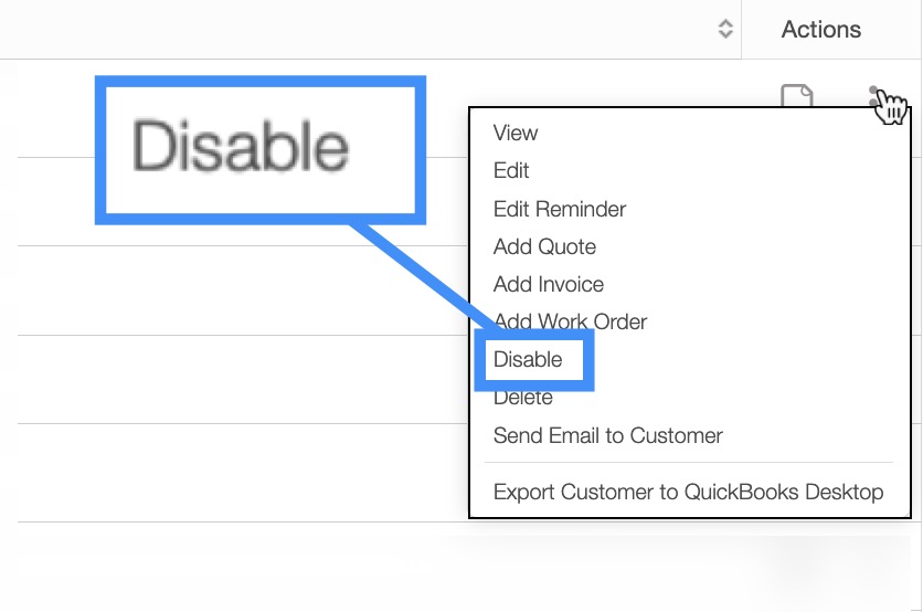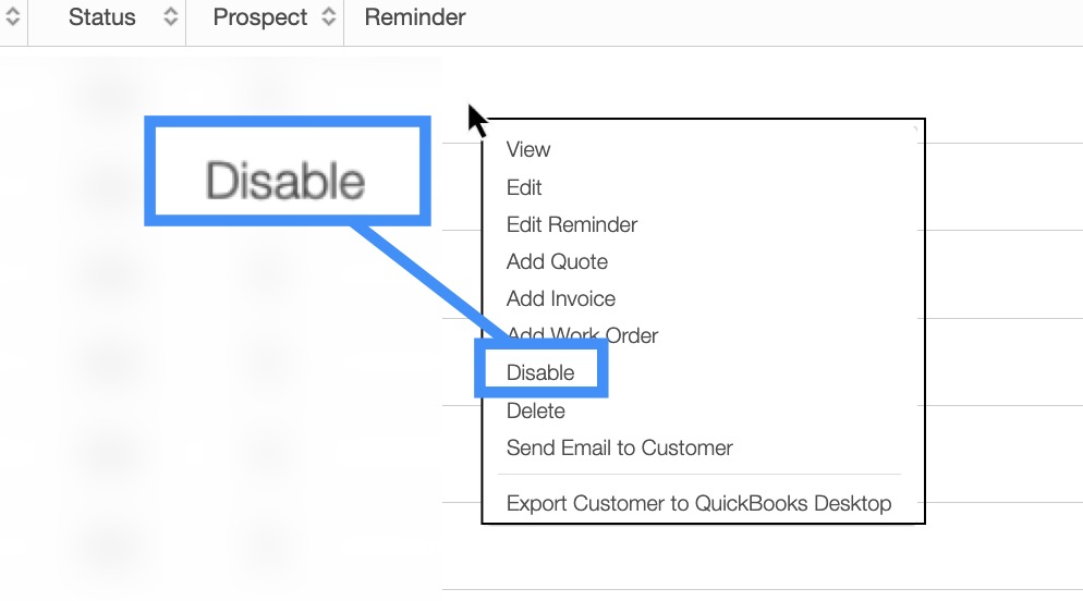 When you disable a customer, you will be unable to create new Work Orders for selected customer and they will no longer show up on the "Customers List" tab.
