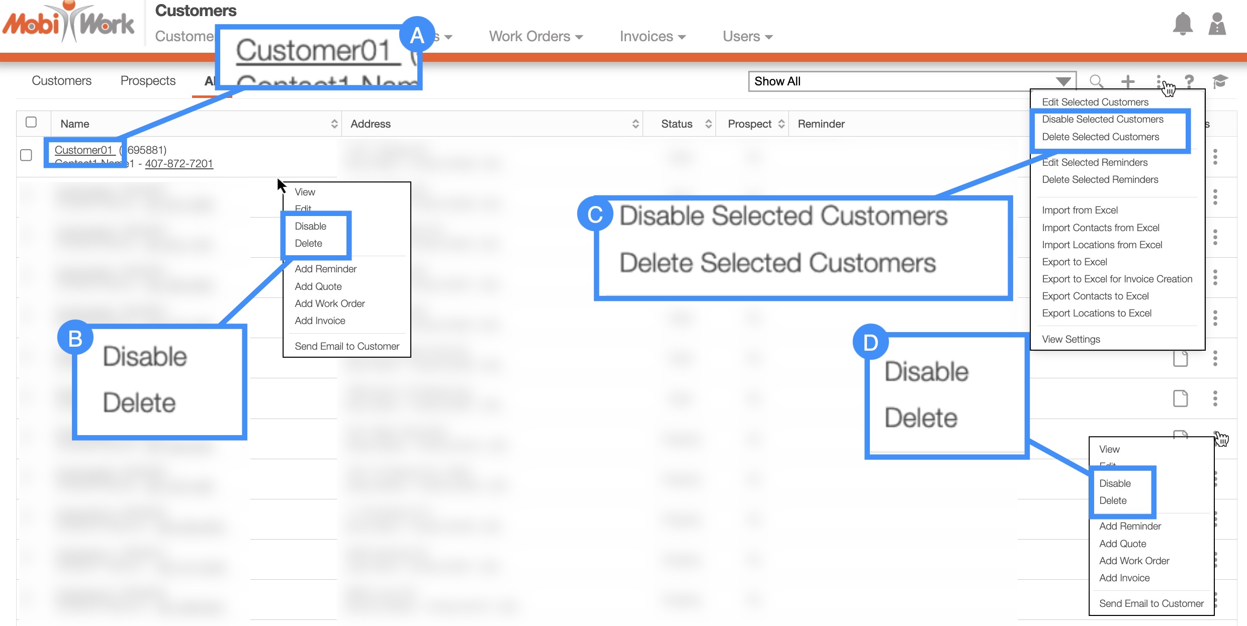 MobiWork will allow you to delete a single customer or multiple customers at once. You also have the option to disable customers.