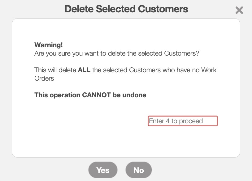 - A warning will then appear asking to confirm if you would like to delete the selected customers, and informing you that the deletion of the customers without work orders will be permanent: