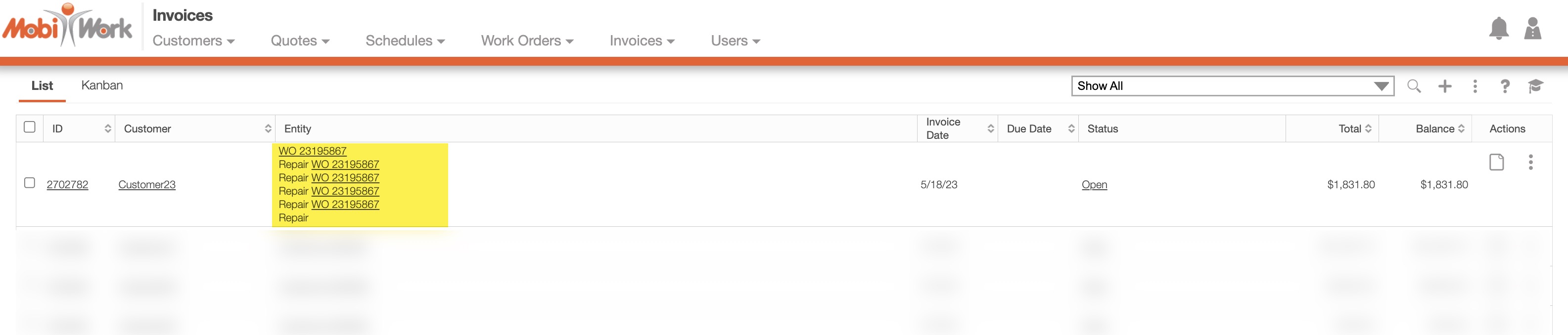 MobiWork will then automatically combine all the selected invoices. You will notice that the original Work Orders, Sales Orders, and Customer Numbers will still be displayed in the Entity Row: