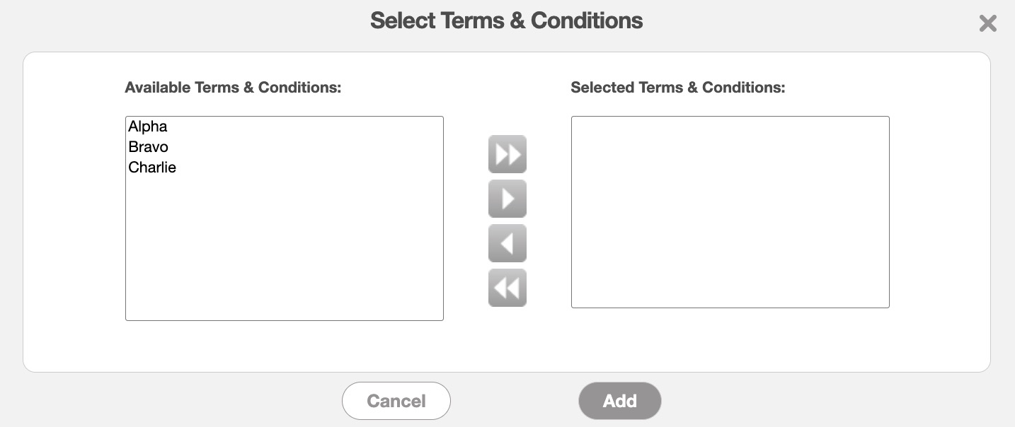 Once you click on the Add Terms & Conditions button, the Add Terms & Conditions pop-up window will appear: