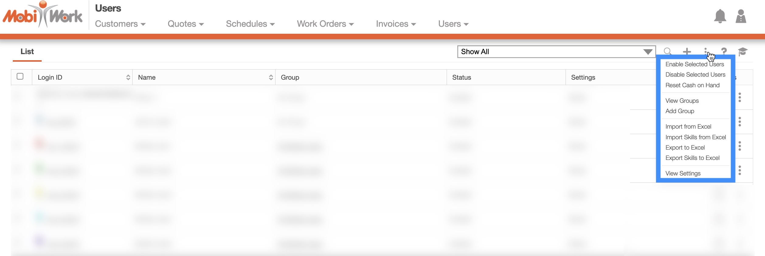 | "Import from Excel" | Imports users from Excel into MobiWork. |