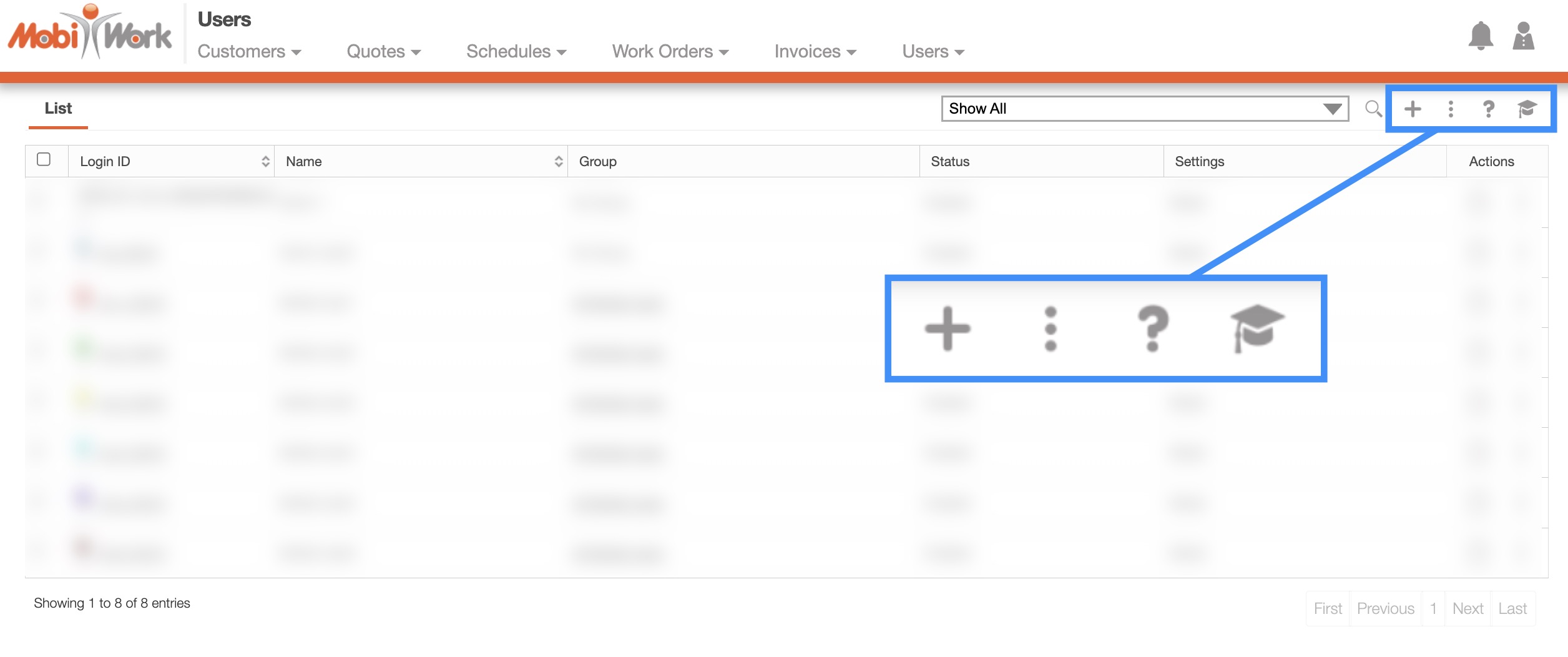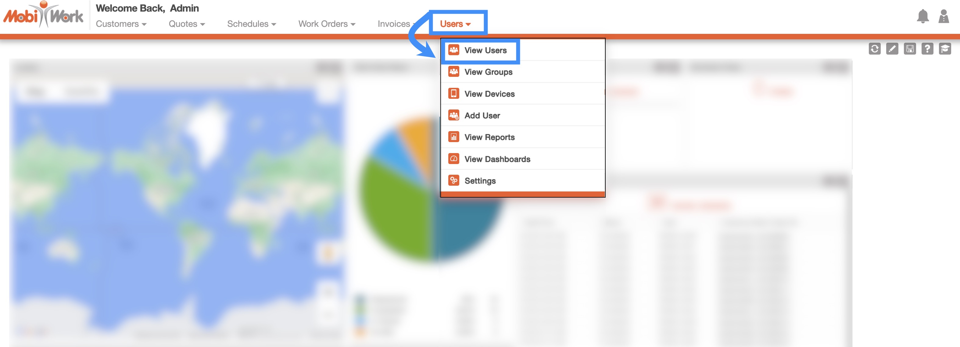 You can access the Users feature page by hovering over the Users feature from your MobiWork menu and clicking on the "View Users" option: