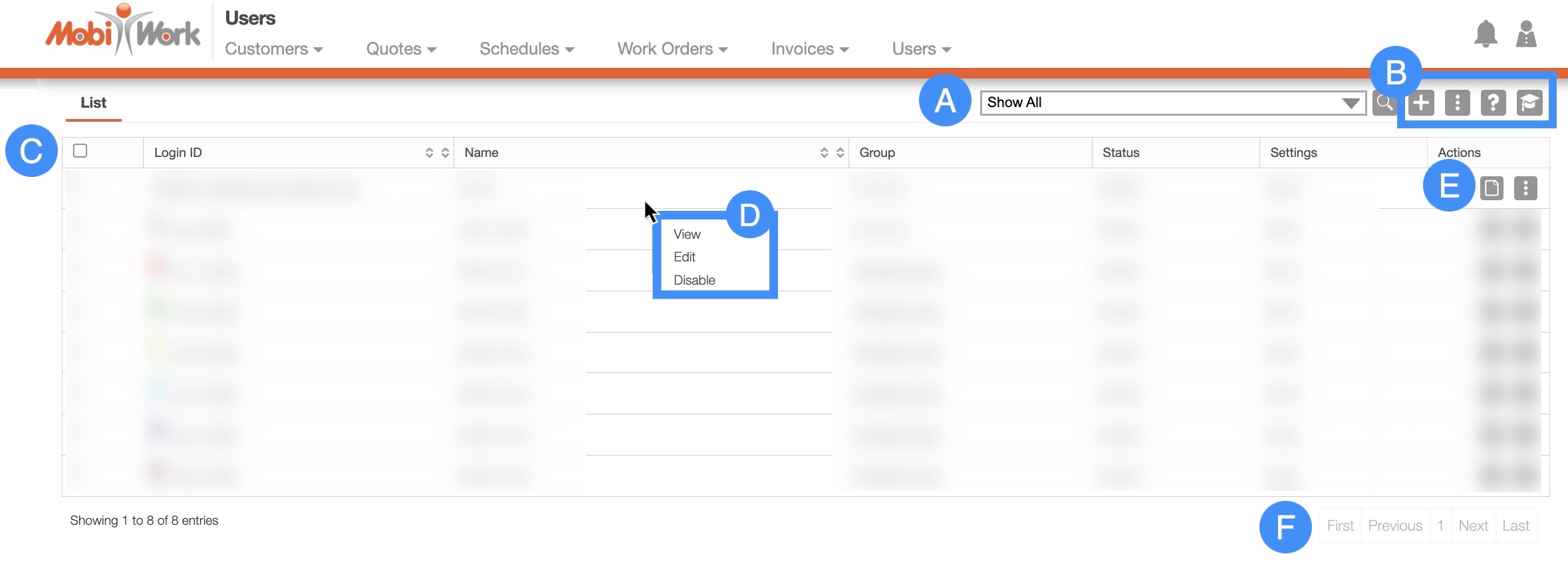 | "Disable" | Disables the selected user (they will no longer be able to login to MobiWork) |