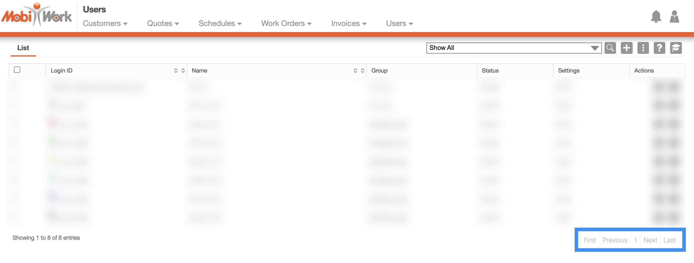 To navigate through these pages, use the First, Previous, Next, and Last buttons located towards the bottom of the Users section.