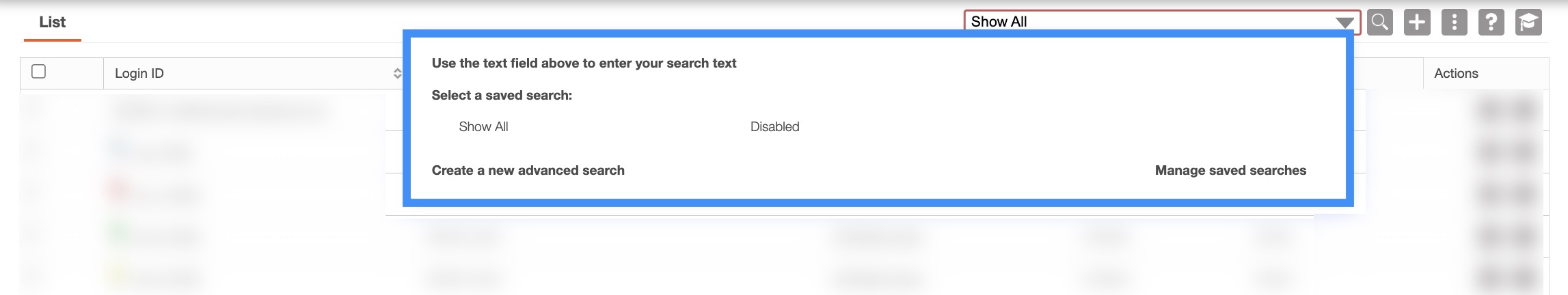 | "Sort by" | Sorts your search in ascending or descending order by: Username, Created Date, Login ID, or Supervisor. |