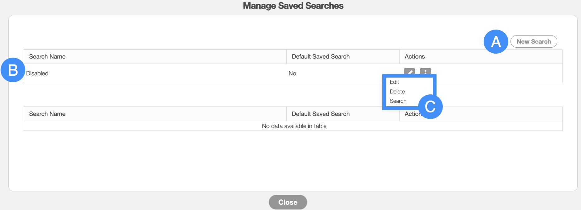 To manage, edit, or remove any Saved Searches you can access the "Manage Saved Searches" option in the drop-down menu; the Manage Saved Searches pop-up window will then appear: