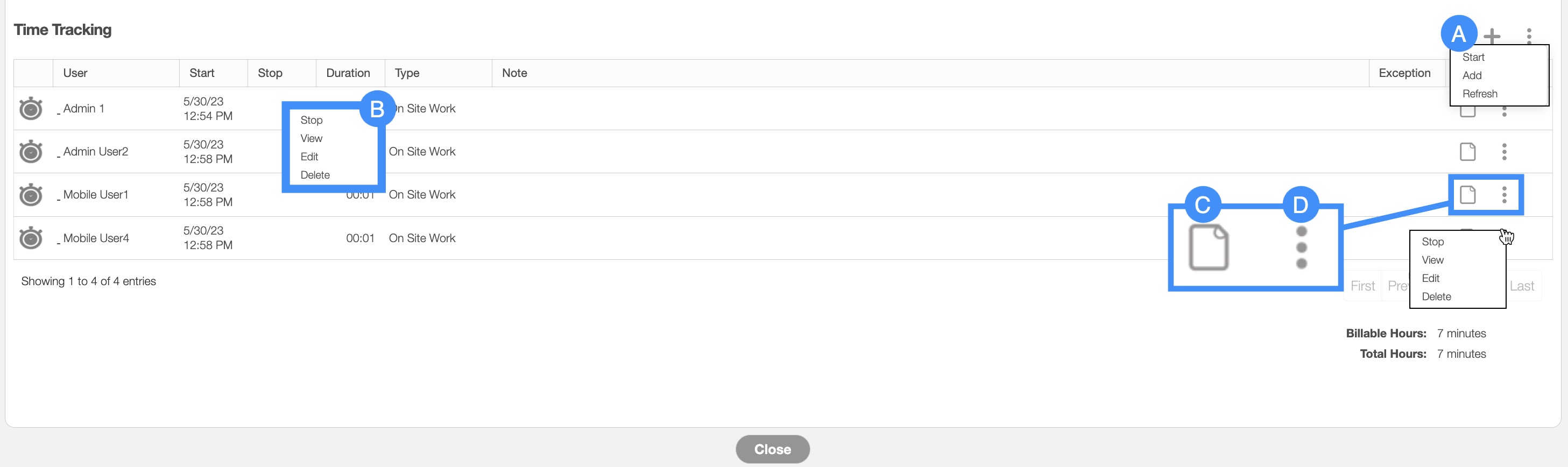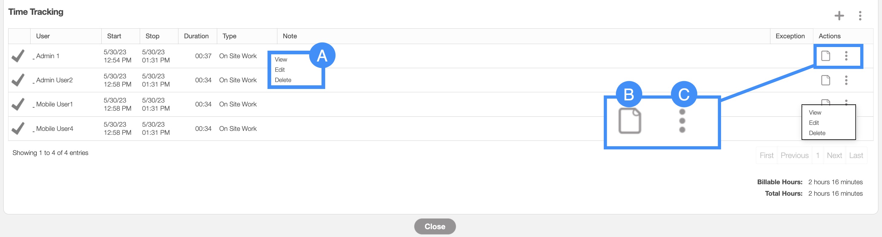 The Individual Actions for a stopped time interval (the three dots next to the View icon) are identical to the right-click actions for a stopped time interval and will allow you to view the hours in a read-only format, edit the time, or delete the time.