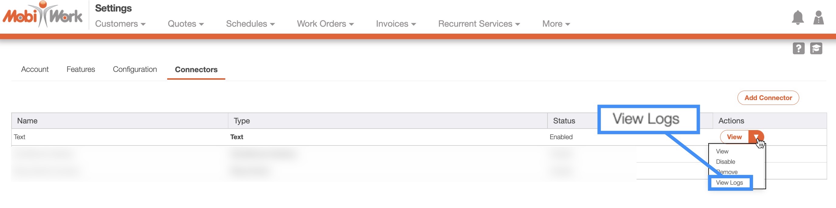 Once you select the "View Logs" option, you will be redirected to the Connectors Logs page. From this page you will be able to see all the text messages that were sent via your MobiWork Text Message Connector: