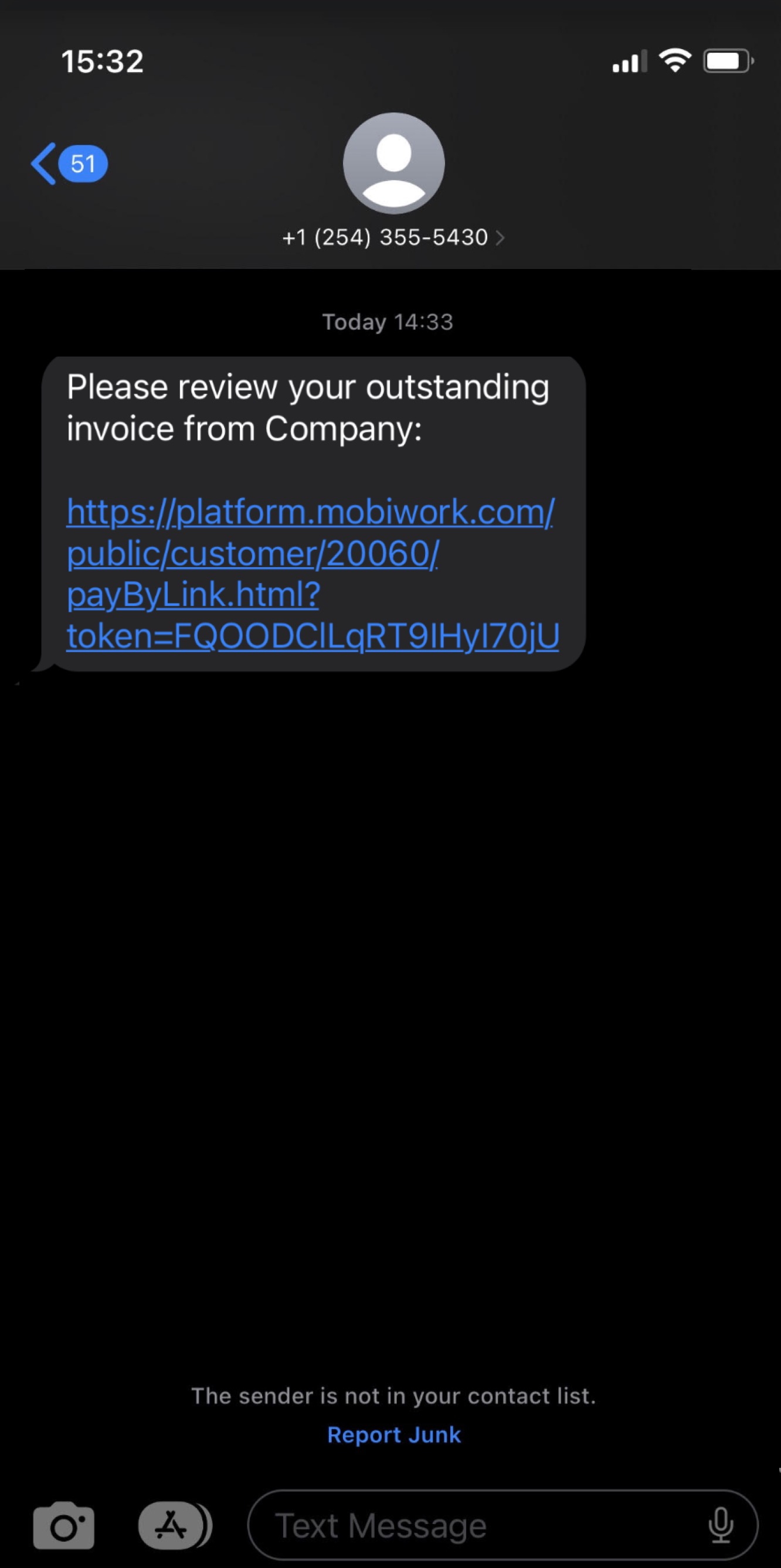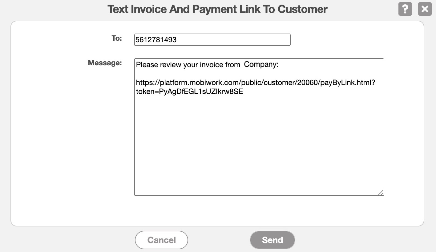 MobiWork will allow you to text your invoice to the customer; you can customize the text message if the invoice is late or if the invoice is being sent is for customer review. Please see the Send Invoices to Customer page for more information on the different ways to access the "Text Invoice to Customer" option.