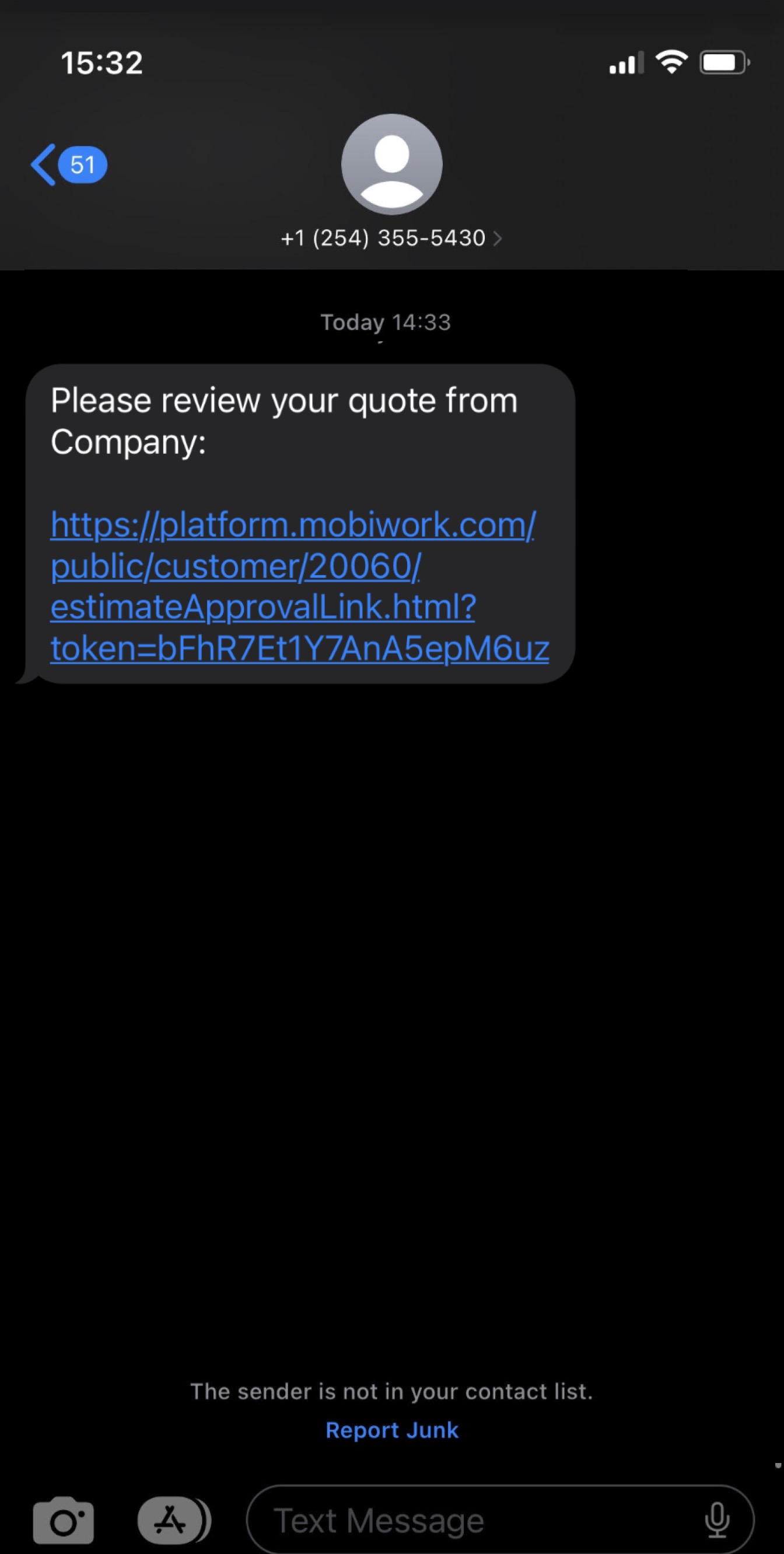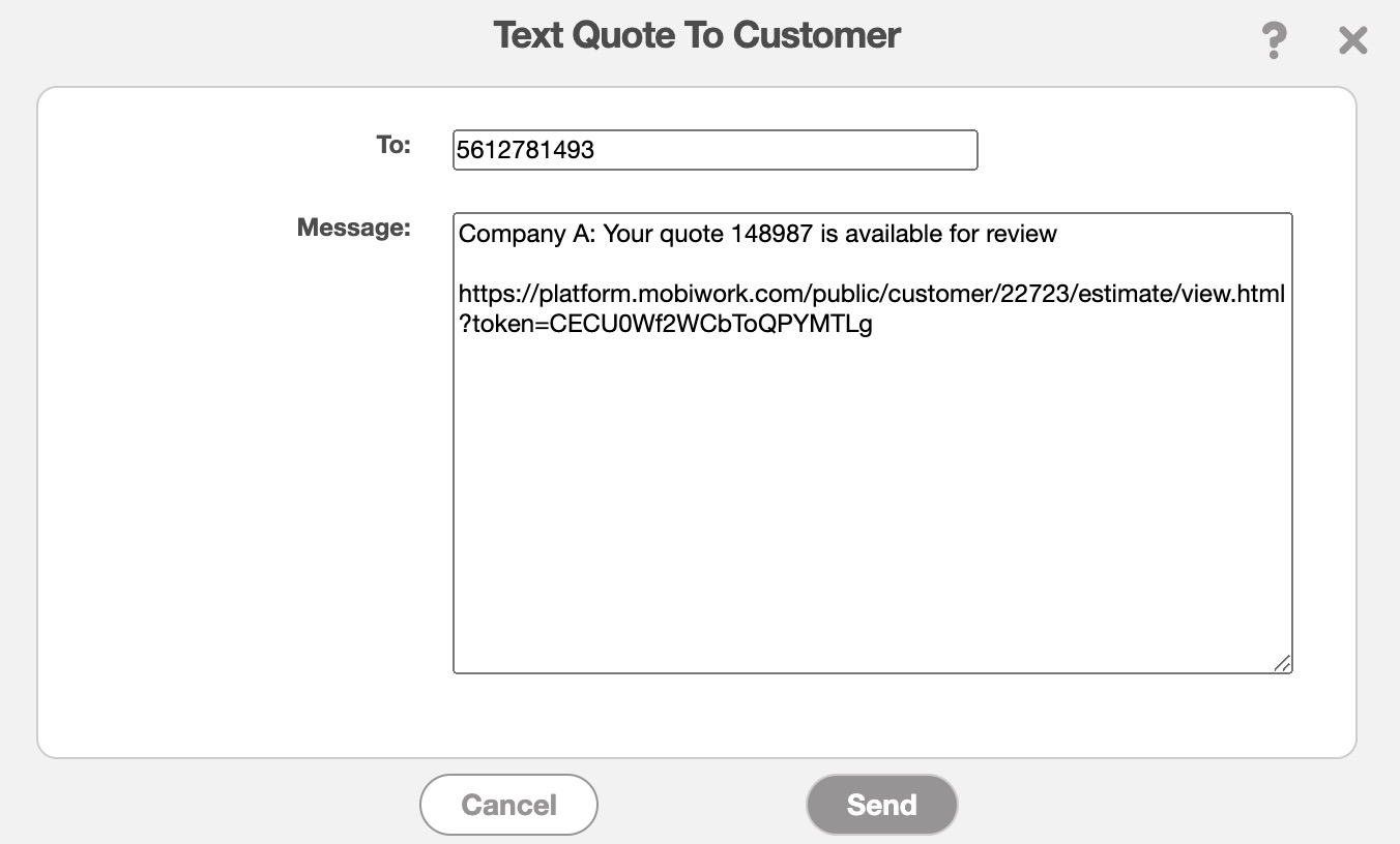 MobiWork will allow you to text your quote to the customer for approval. Please see the Send a Quote for Approval page for more information on the different ways to access the "Text Quote Approval to Customer" option.