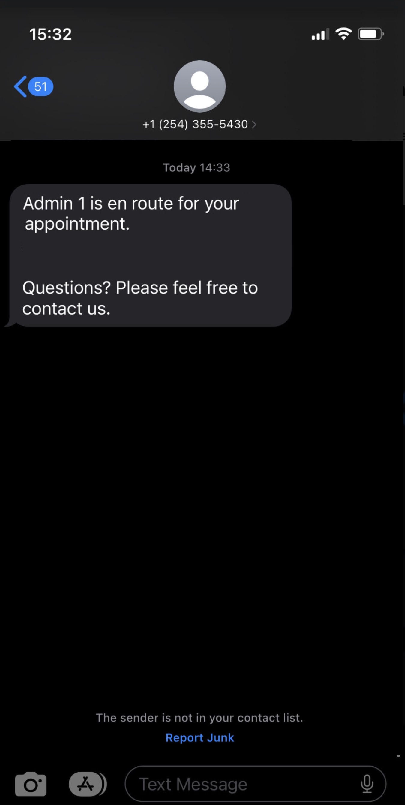 If all the requirements are met, as soon as you update the work order status to "In Transit," an automatic en route message will be sent to your customer, as featured below: